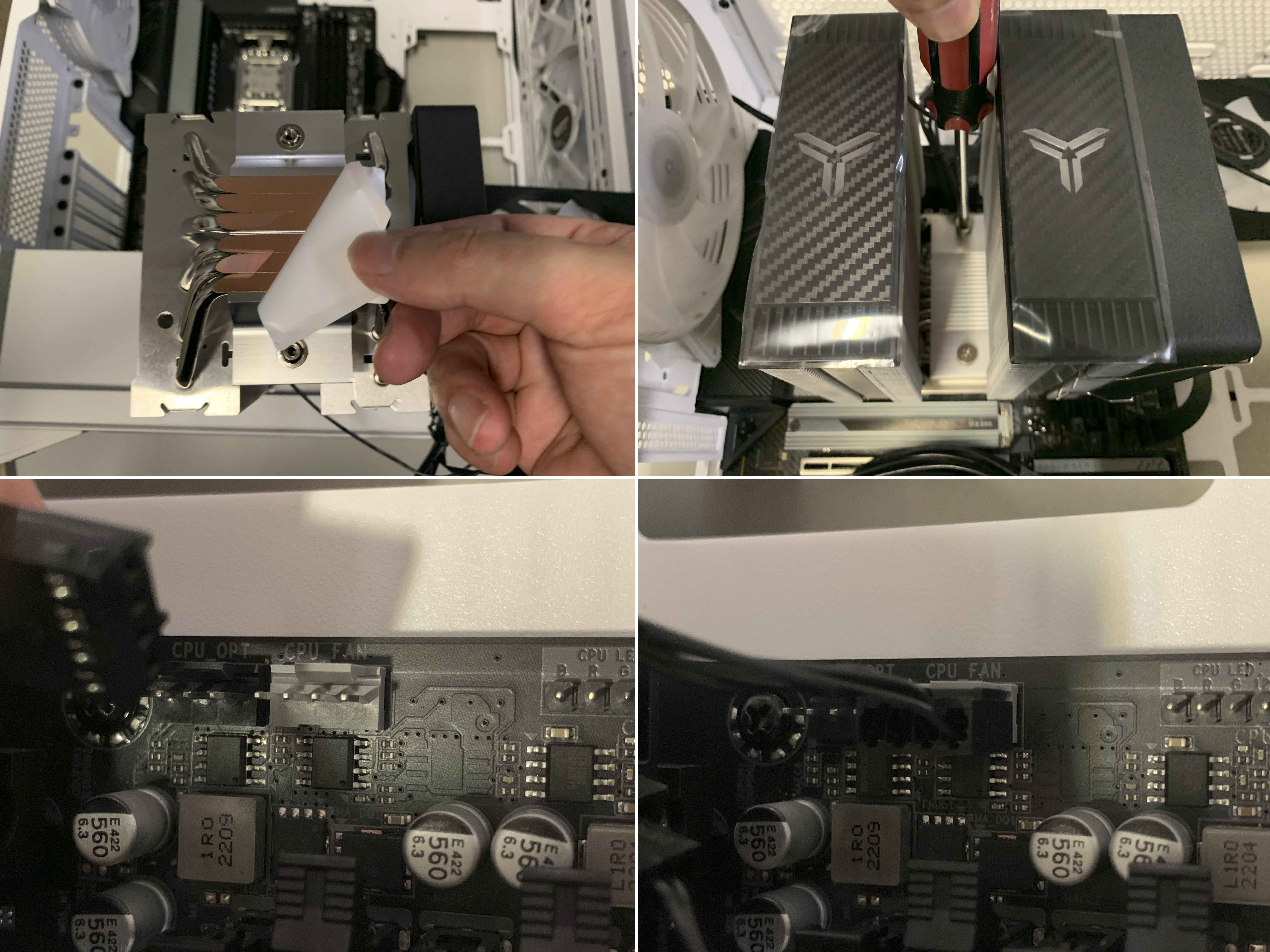 스티커를 제거하고 양쪽에 있는 나사를 2회~3회 번갈아 가면서 조여가며 고정하고, 팬에 연결된 4핀을 메인보드의 CPU FAN에 연결하여 조립을 마무리 합니다. JONSBO 쿨링팬 조립시 장력이 강하지 않아 타사 제품에 조립이 간편하다고 느끼게 해주었습니다.