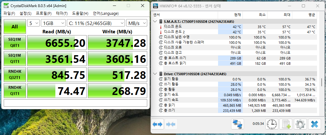SSD 히트싱크가 없어서 온도가 많이 높진 않을까 우려했지만, 히트싱크가 없더라도 평균 47도 최대 57도로 성능 저하 없이 100% 성능을 활용할 수 있는것을 알수 있습니다.