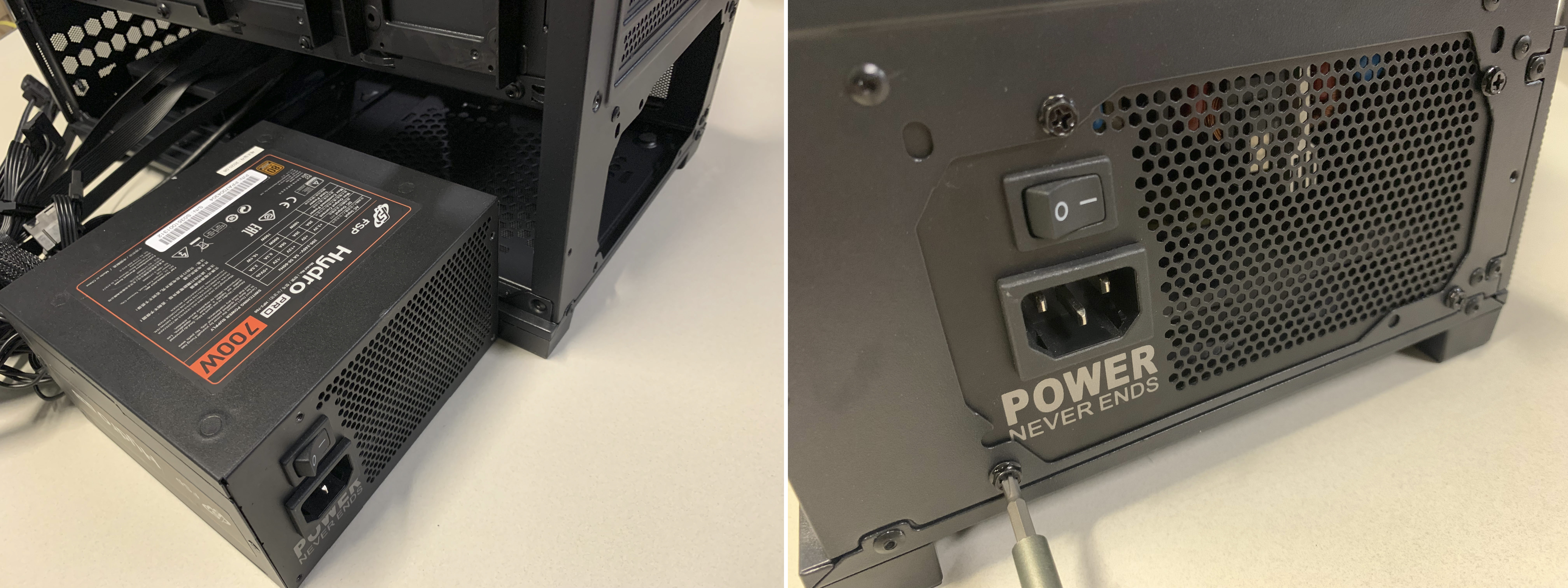 파워케이블 장착 파워 서플라이를 나사 4개로 고정하고, 24핀 전원, 8+4핀 보조전원, Type-C, HD-Audio 등 케이블을 각각 연결합니다.