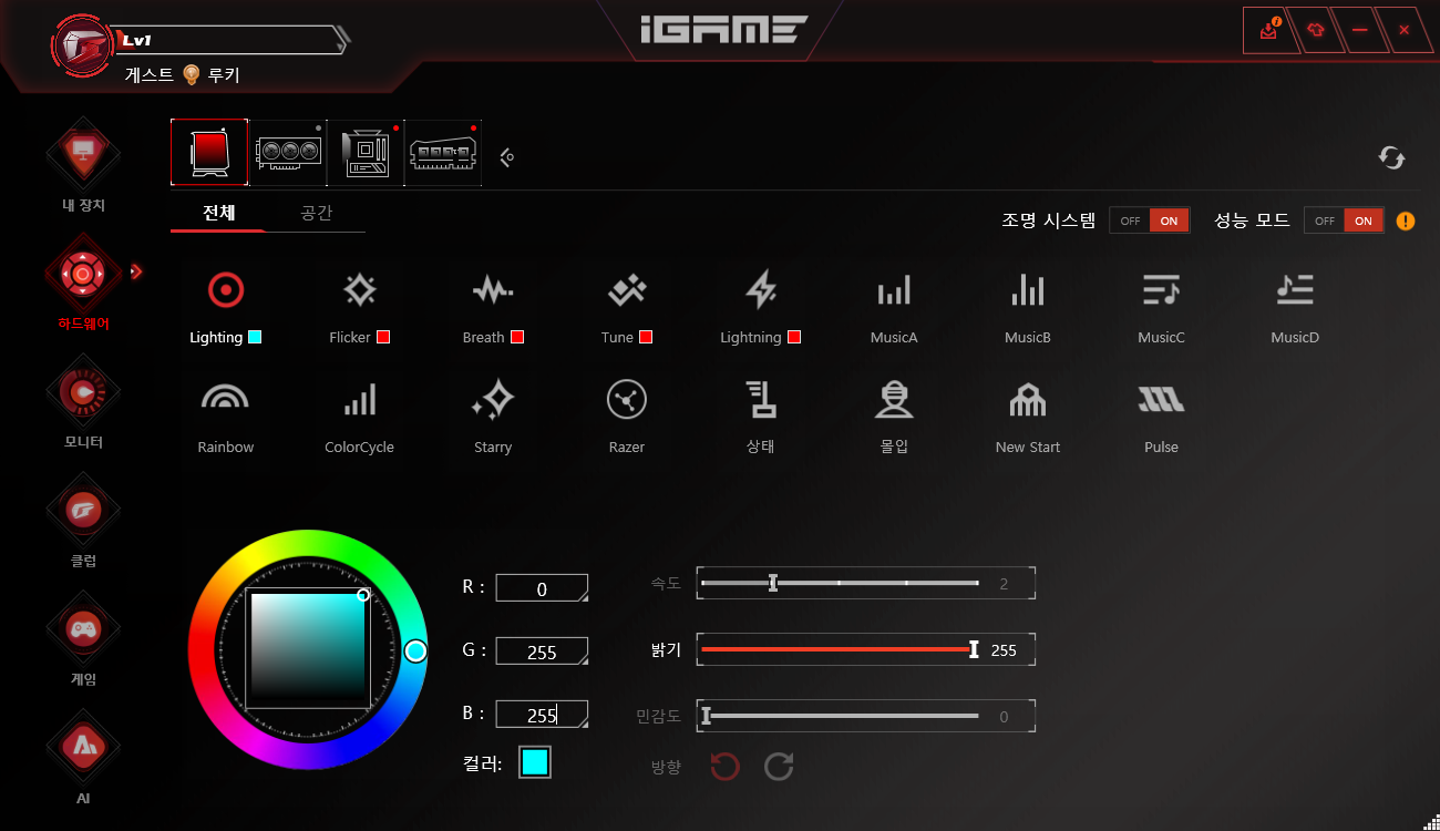 메인보드에서 지원하는 소프트웨어에서 LED의 다양한 효과, 컬러를 자유롭게 변경하여 사용자의 취향대로 시스템을 튜닝할 수 있습니다