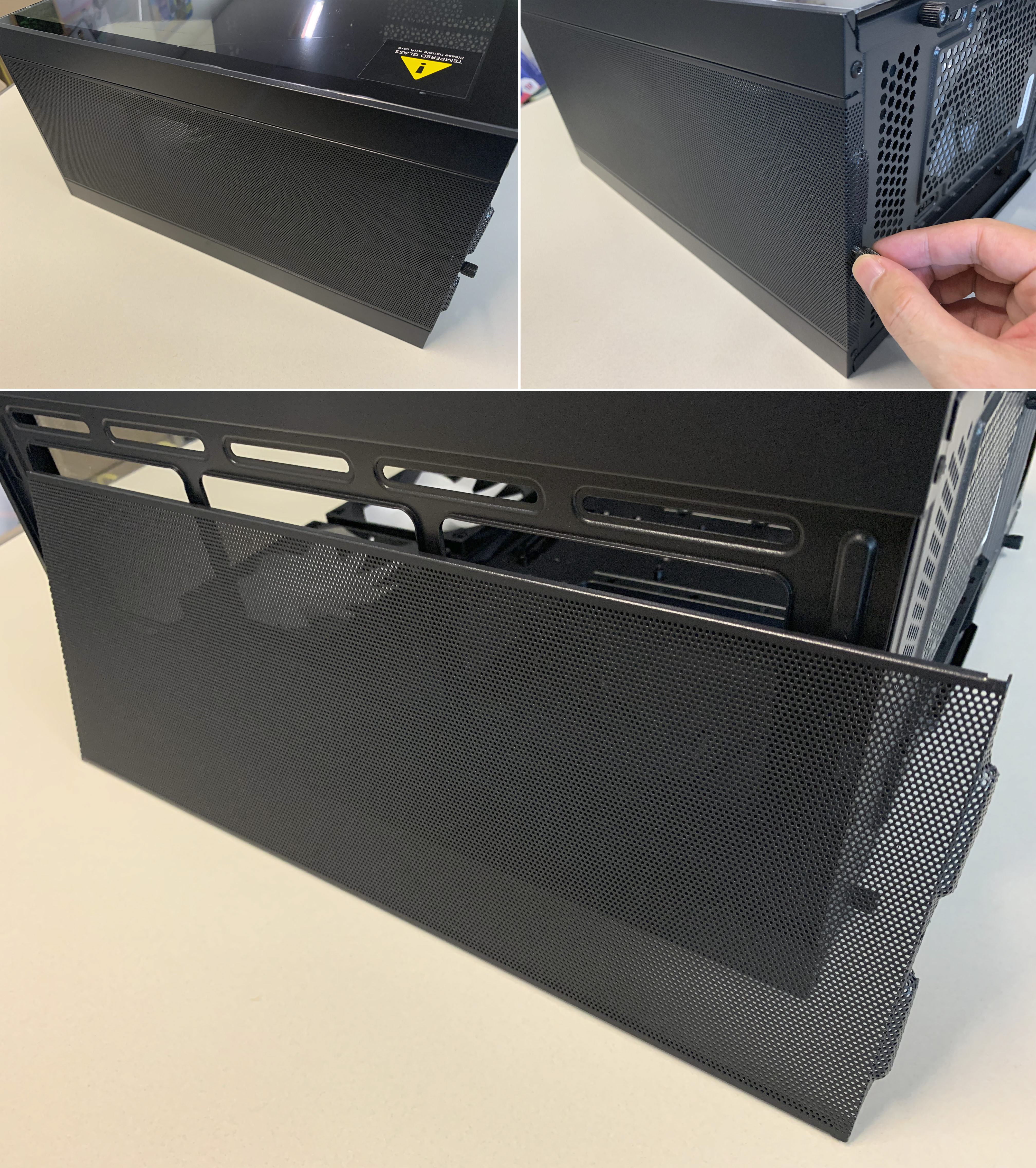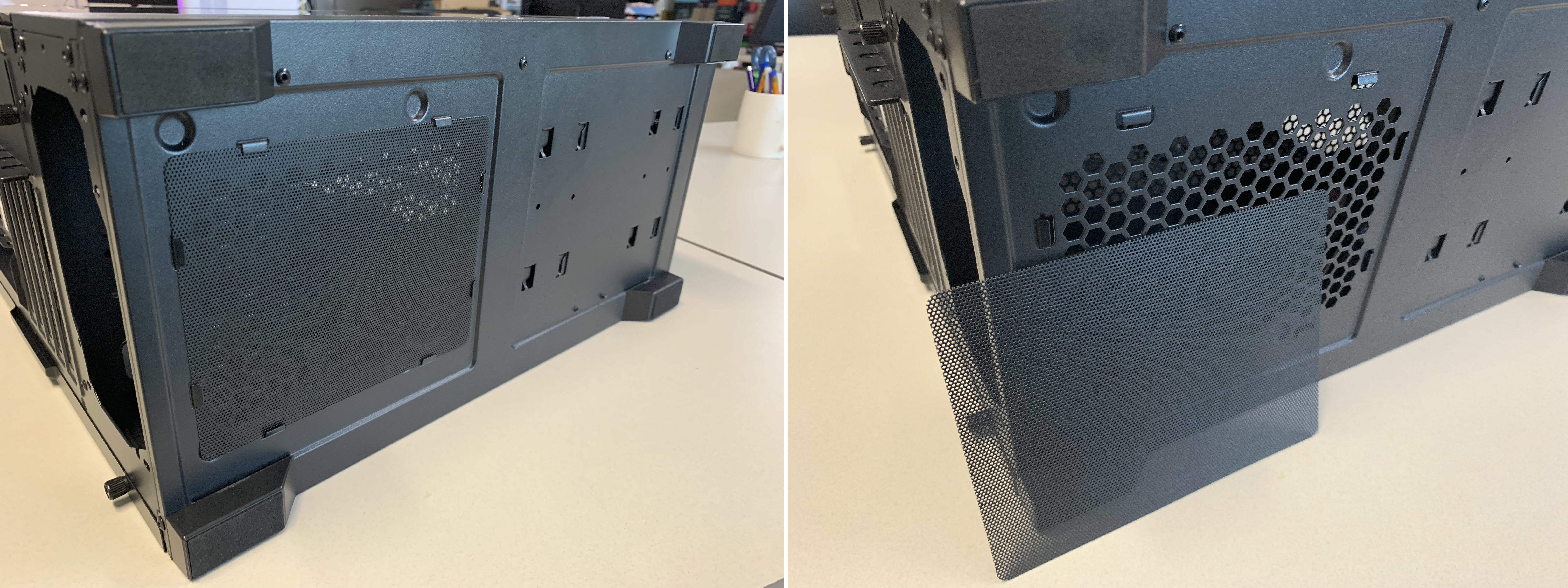 측면 패널 또한 손나사를 이용하여 도구 없이 쉽게 탈부착이 가능하며, 먼지 필터는 마그네틱 먼지 필터가 적용되어 있어서 외부 먼지를 차단하여 시스템을 보호하도록 설계되어 있습니다.