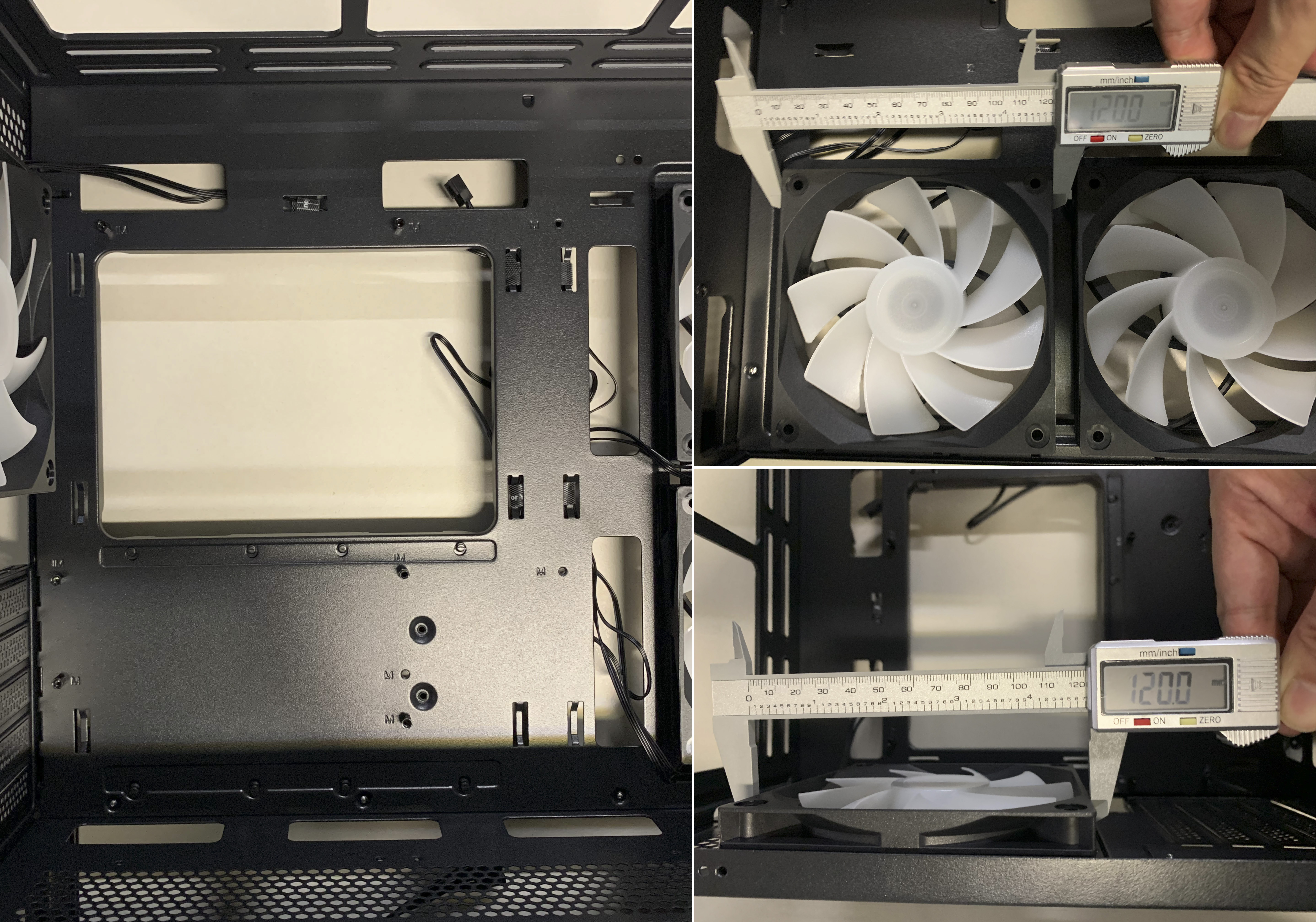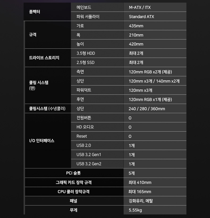 스펙을 간단히 살펴보면, 210 X 420 X 435mm(W x H x D) 크기, 무게 5.55kg의 미들타워이며, 후면 쿨링팬 120mm 1개, 측면 쿨링팬 120mm 리버스 2개 등 총 3개의 쿨링팬을 기본 장착되어 있습니다. 라디에이터 상단 120mm x 3개 혹은 140mm x 2개 설치가능합니다.