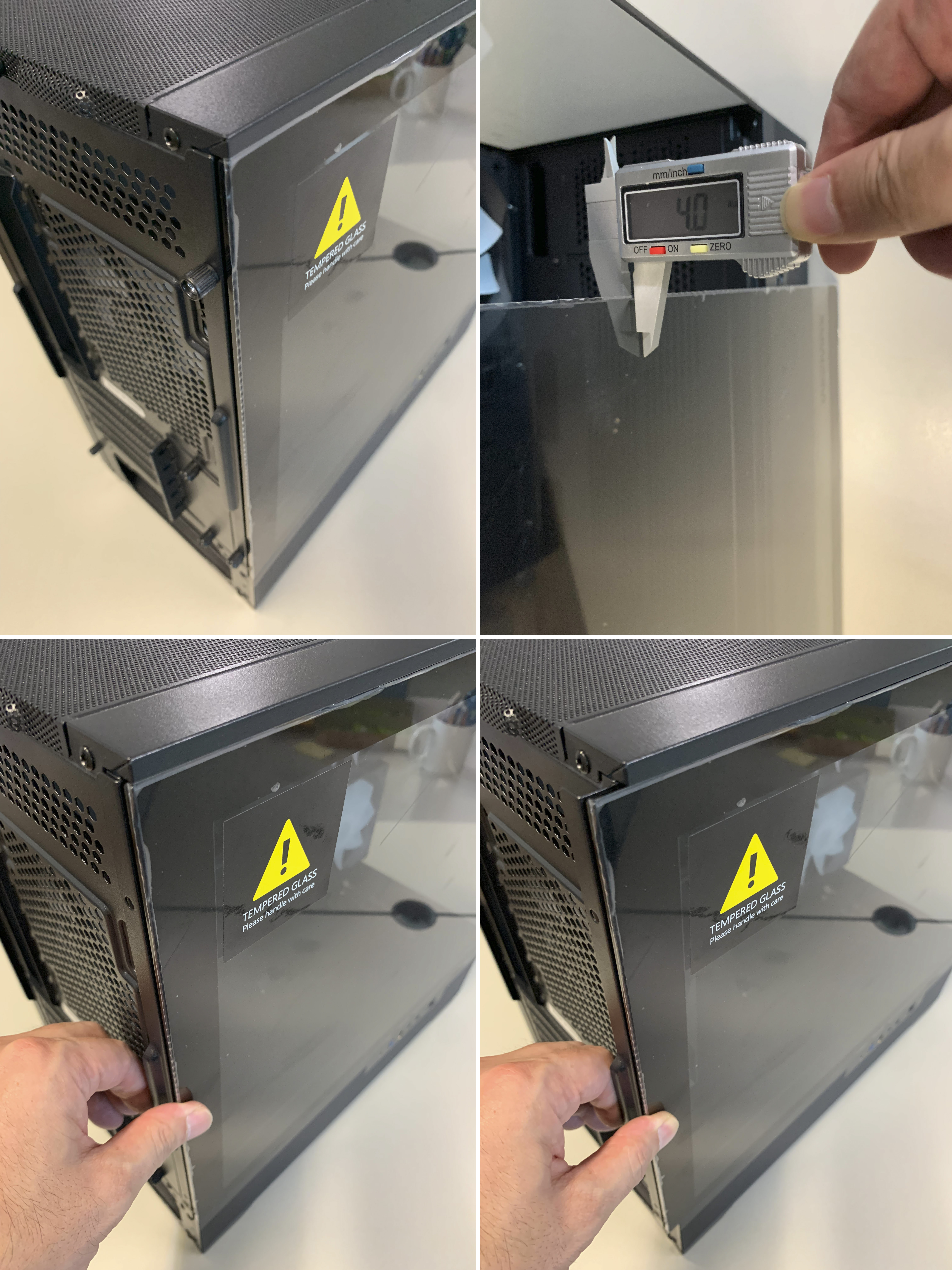 측면 강화유리는 손나사로 분리가능하며, 두께가 40mm로 측정되었고, 실제 강화유리를 분리해서 들어보면 아주 묵직해서 안정감이 듭니다.