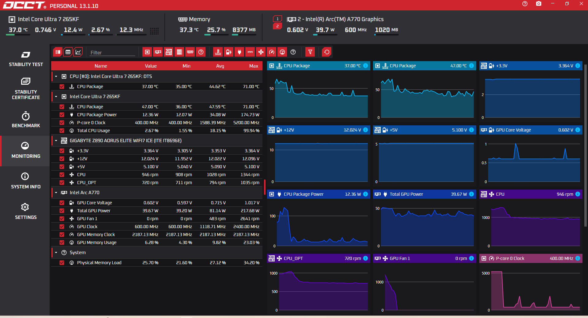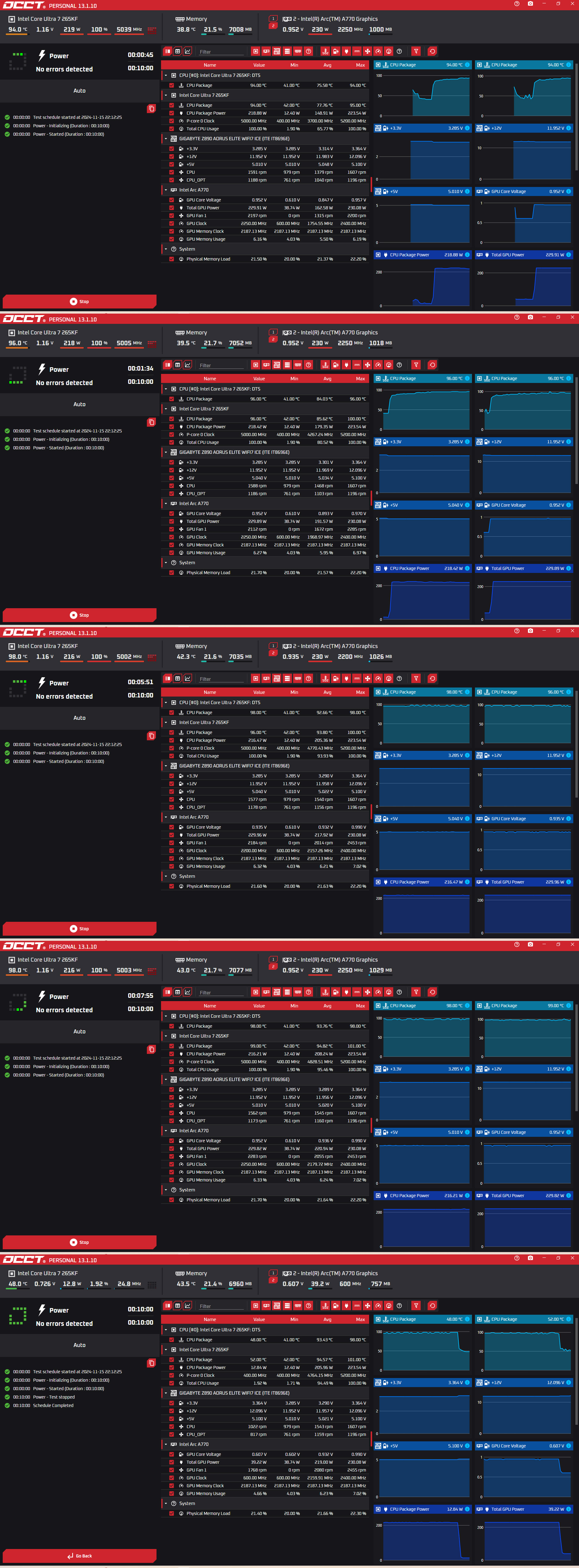 CPU, 그래픽카드 등의 FULL LOAD(과부하) 테스트를 진행했으며, 테스트 중간마다 확인했지만 안정적인 전압 공급이 일어났으며 전혀 출렁임이 없었었습니다.