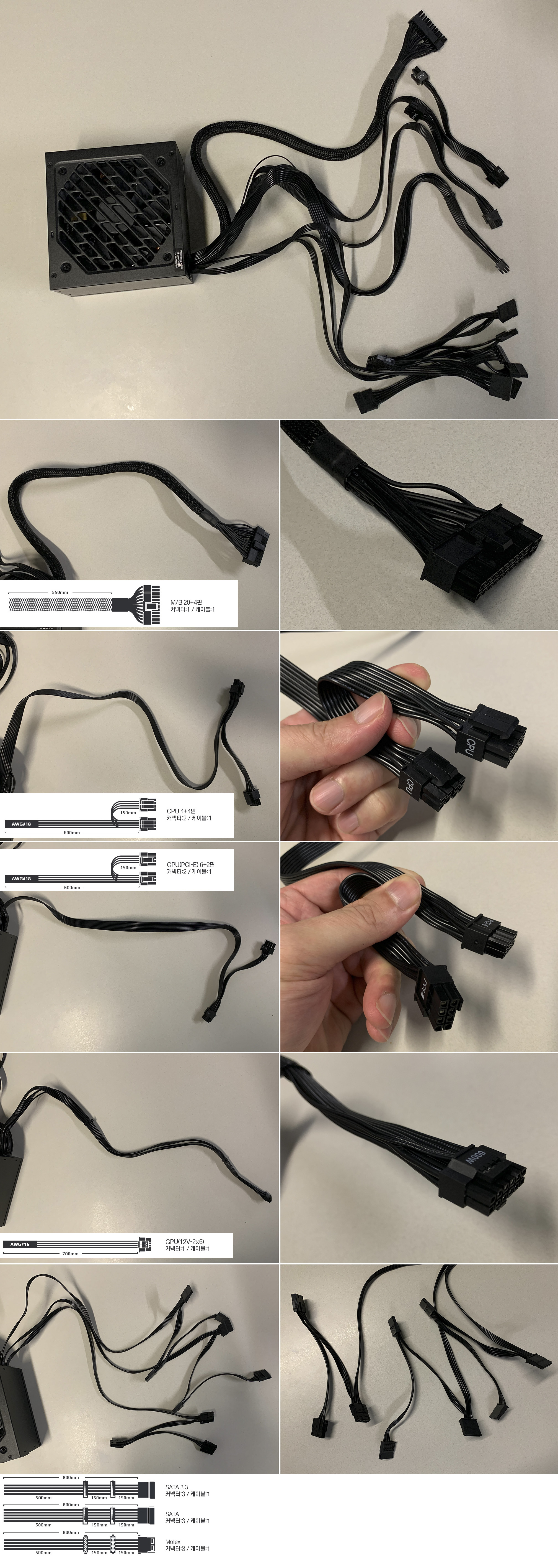 메인보드 24핀 커넥터는 Mesh Shield 재질 적용되었으며, 나머지는 모두 유연한 플랫 블랙 케이블을 적용하여 조립할때 정리가 편리하며, 조립이 완성되었을때 디자인이 깔끔하고 고급스럽습니다. 또한 최신 RTX 4000 시리즈에 호환되는 12V-2x6 케이블도 포함되어 있습니다.