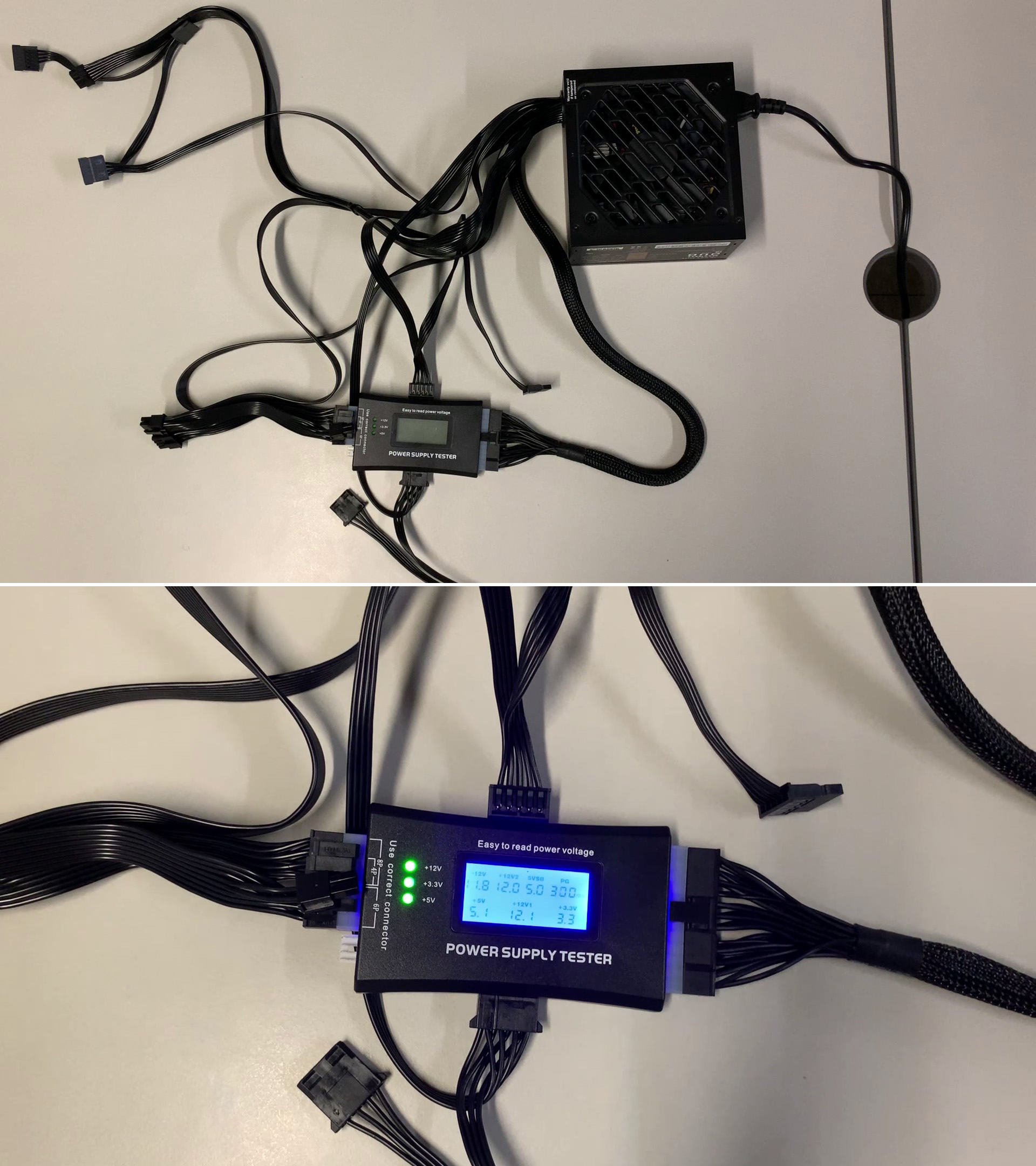 메인보드 24핀, CPU보조 전원 8핀, SATA케이블을 연결한 상태에서 +12V, +5V, +3.3V가 정상 범위에 있음을 확인했습니다.