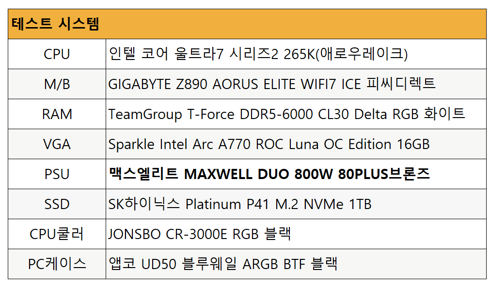 지금까지 맥스엘리트 MAXWELL DUO 800W 80PLUS브론즈 PCIE5 플랫 파워서플라이에 대해서 살펴보고, 조립 및 테스트를 해보았습니다.