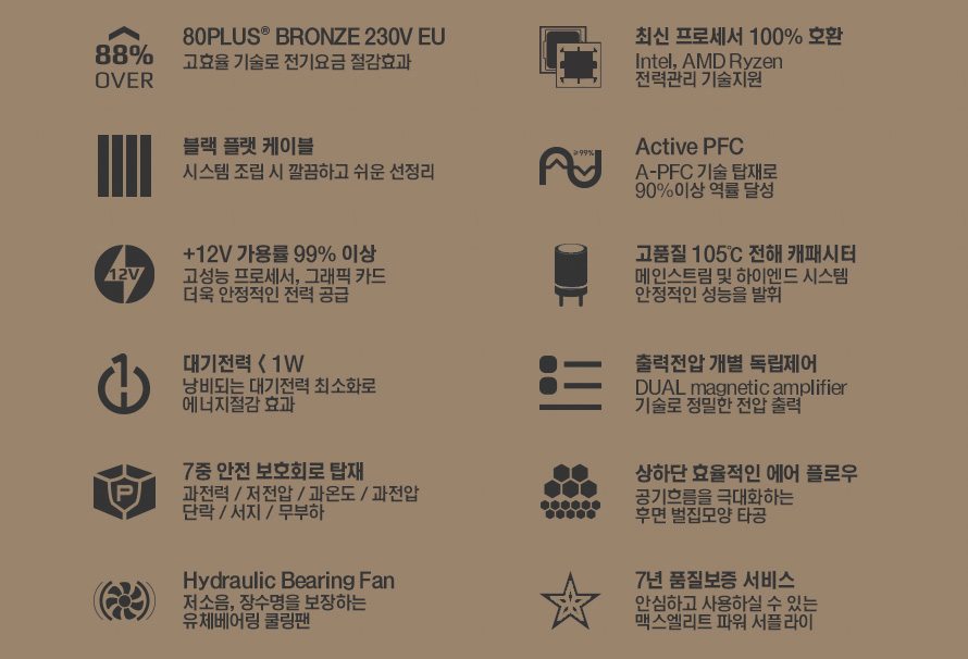 뛰어난 성능과 부담없는 가격으로 가성비가 뛰어난 파워서플라이를 맥스엘리트의 투명하고 신속한 무상 AS 7년 기간동안믿고 사용할 수 있습니다.