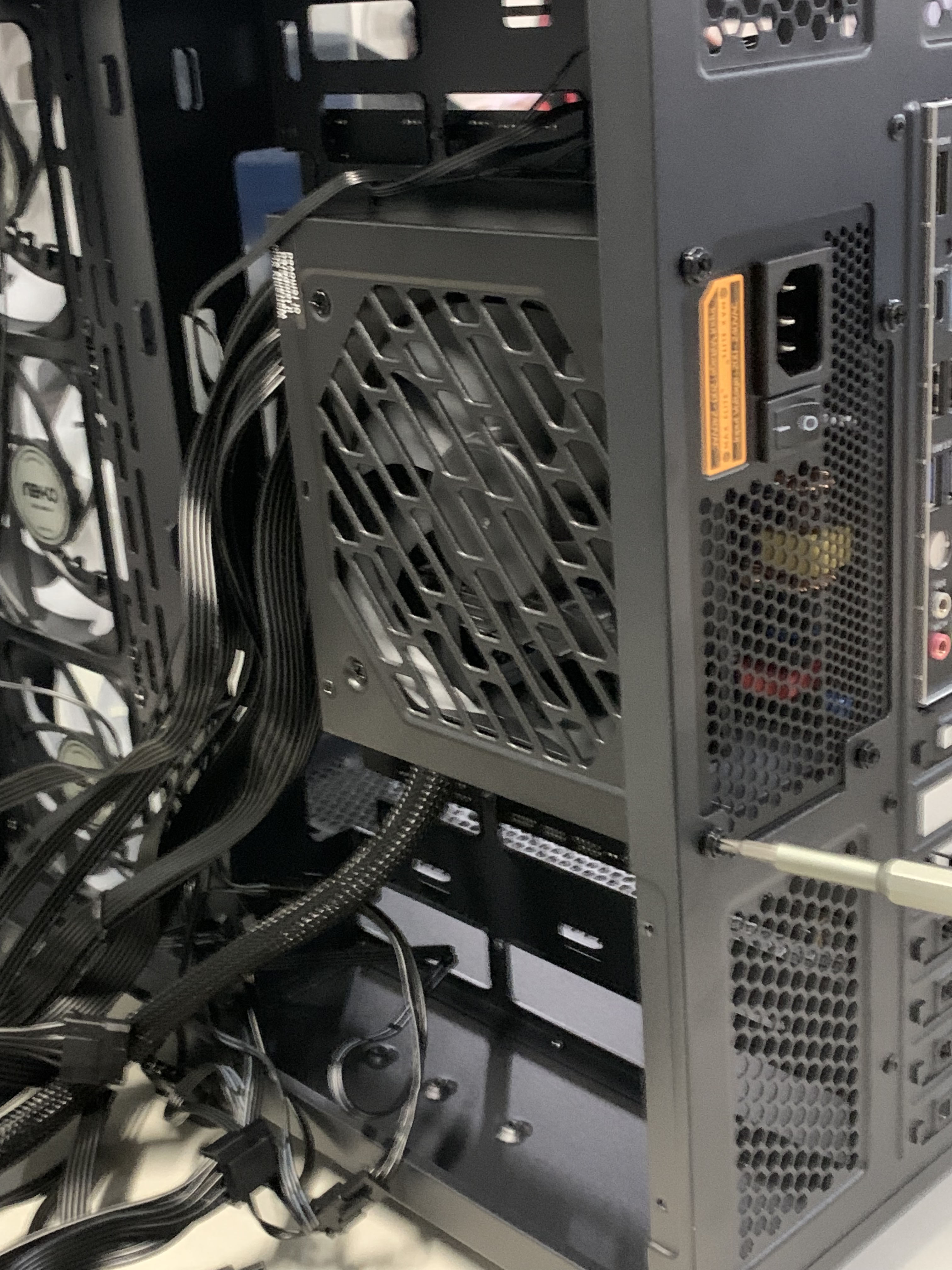 시스템에 사용할 케이블을 메인보드와 파워 서플라이에 연결하고 PC케이스에 4개의 나사로 고정합니다.