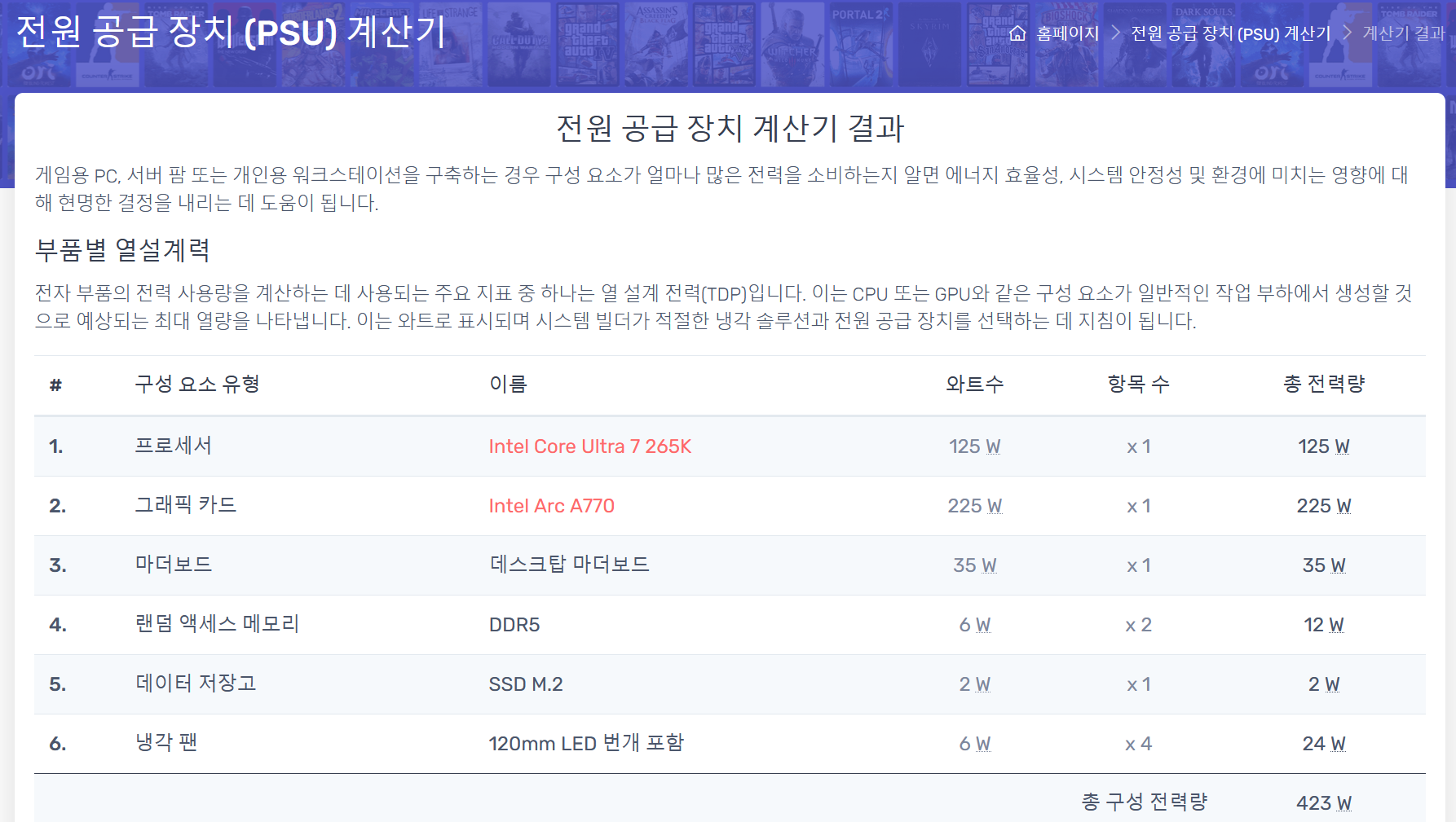 시스템에서 사용하는 전력량을 직접 측정할 수 있는 측정 기기가 없어서, 테스트 시스템 구성으로 예상 전력량 423W을 산출했습니다. 실사용에서는 인텔 코어 울트라7 시리즈2 265K 225W, 인텔 Arc A770은 230W가 사용되기 때문에 벤치테스트를 진행하는 동안 약 520W가 적용되었습니다.