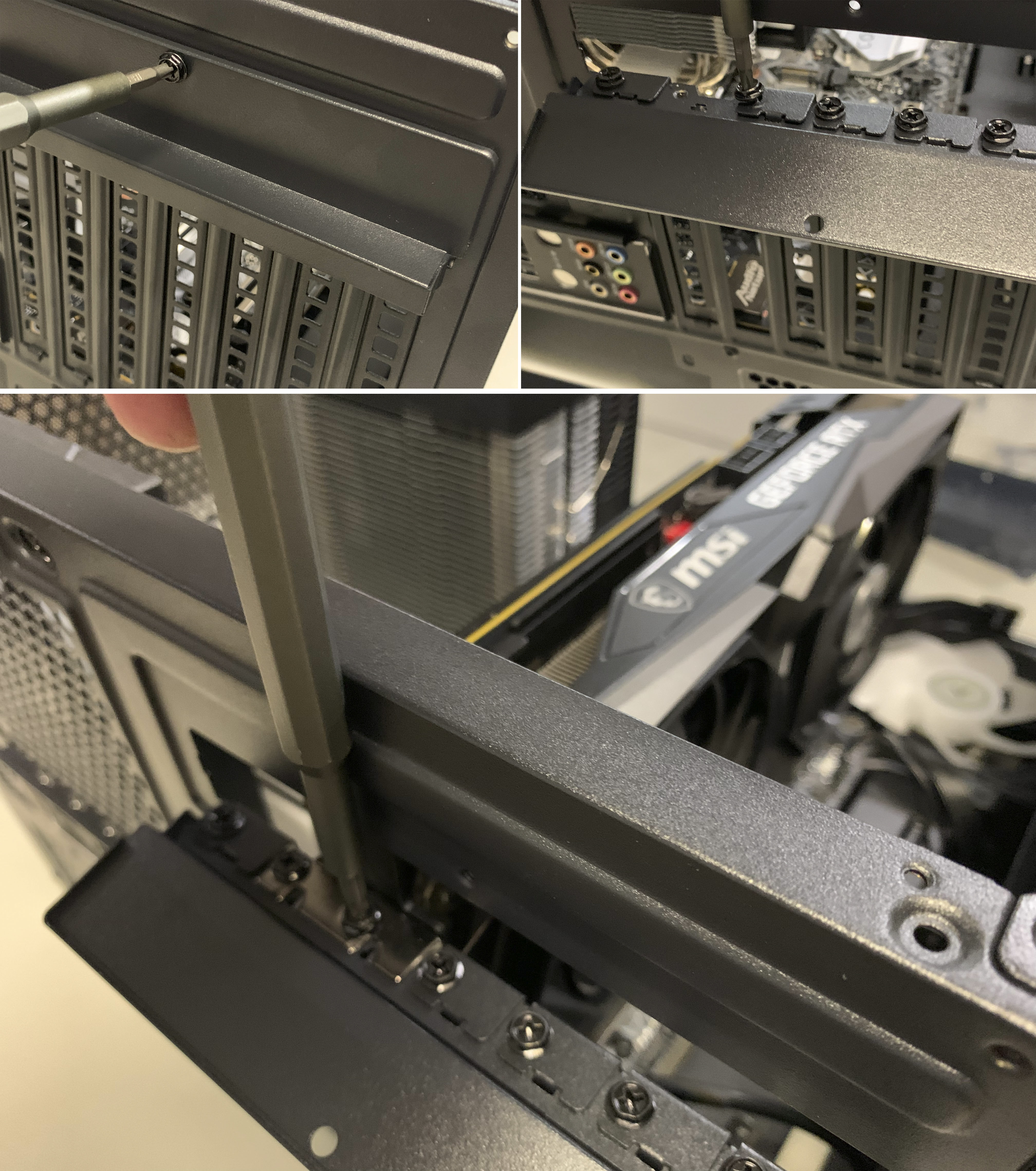 PCI 슬롯을 나사를 풀고 분리한 다음, 그래픽카드를 장착 및 고정 합니다.