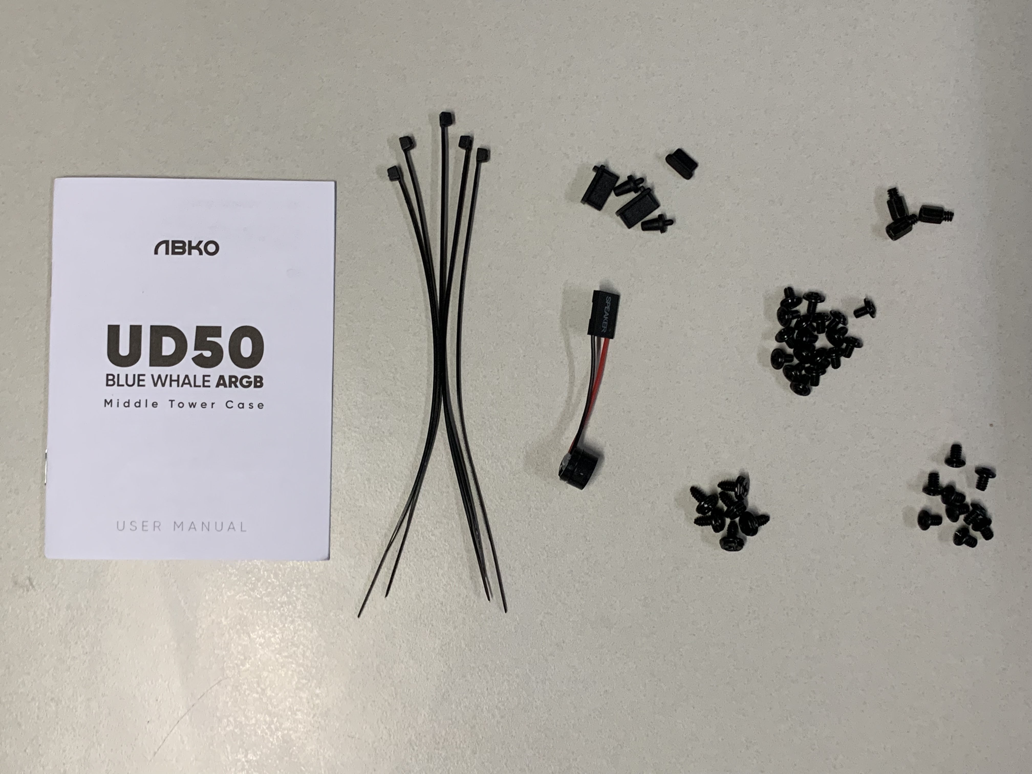 전체 구성품은 앱코 UD50 블루웨일 ARGB BTF 케이스 본품, 가이드, 조립에 사용되는 케이블 타이, 포트 고무 마개, 스피커, 고정 나사 등이 포함되어 있습니다. PCI 슬롯 커버가 보이지 않는데, 앱코 UD50 블루웨일 ARGB BTF 케이스는 모든 PCI 슬롯이 나사로 탈부착이 가능하게 되어 있습니다.
