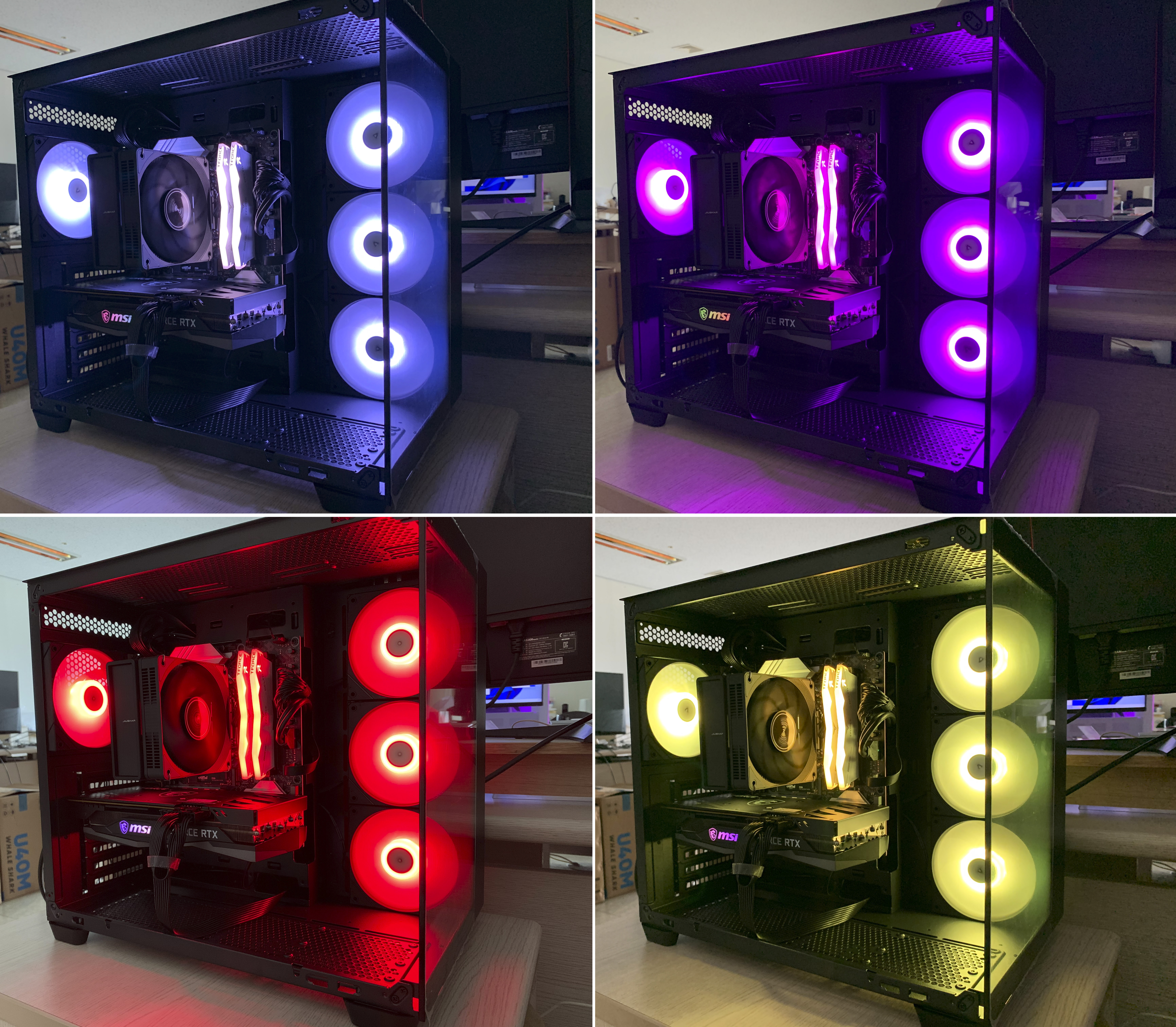 120mm ARGB 쿨링팬은 메인보드 5V 3핀에 연결하여 LED의 다양한 패턴과 컬러를 사용자의 취향대로 튜닝이 가능하며, 후면 정방향 1개, 측면에는 역방향(리버스) 3개가 기본 제공됩니다.