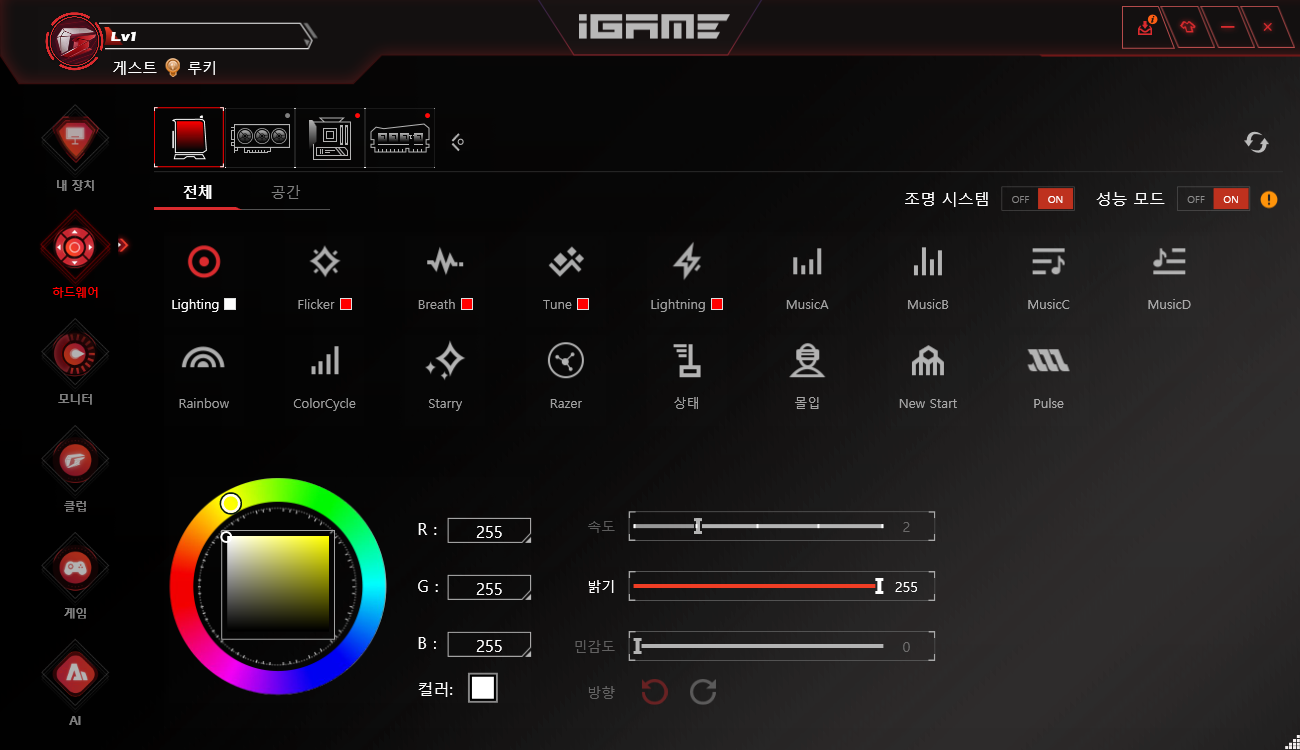 메인보드에서 지원하는 소프트웨어를 통해서 다양한 LED모드와 RGB컬러를 셋팅할 수 있습니다. 소프트웨어를 사용하지 않고 리셋버튼을 눌러서 취향에 따라 변경이 가능합니다. 리셋버튼(LED)을 3초 이상 길게 누르면, 모드 변경이 가능합니다.
