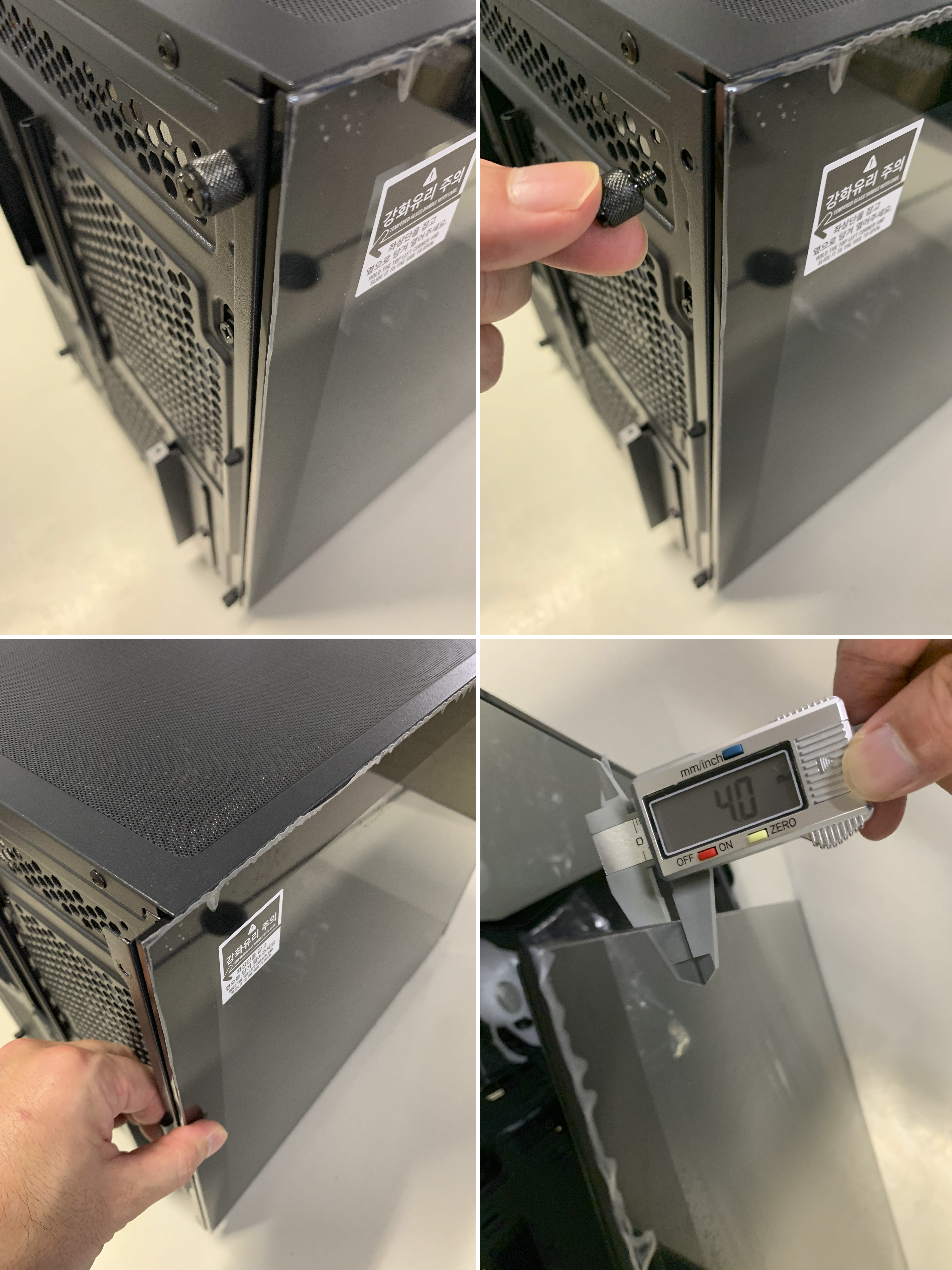 측면 강화유리는 손나사로 분리가능하며, 두께가 40mm로 측정되었고, 실제 강화유리를 분리해서 들어보면 아주 묵직해서 안정감이 듭니다.