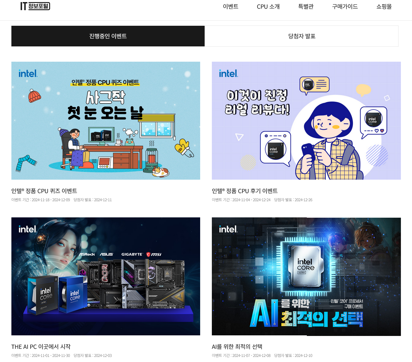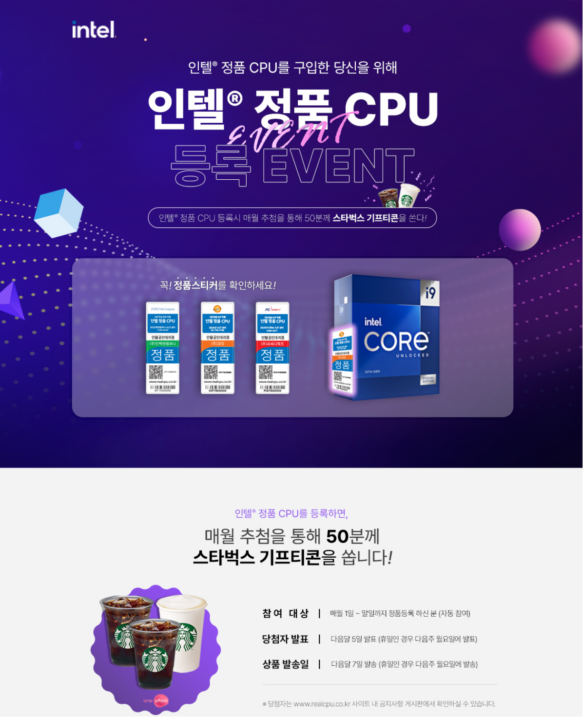 인텔 정품 CPU 등록 고객에게 아메리카노 기프티콘을 드립니다. (매달 50명 추첨)정품 등록 이벤트(https://www.realcpu.co.kr) 외에도 매 분기당 IT정보포털(https://www.allaboutpc.co.kr)에서 다양한 이벤트를 진행하니까, 가끔 방문하셔서 인텔 소식도 보고 이벤트에 참여하시는걸 추천합니다.