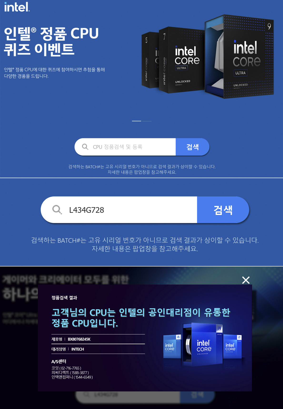 인텔 CPU 각 3사 공인대리점(코잇, 피씨디렉트, 인텍앤컴퍼니) A/S 센터에서 3년 무상 A/S를 지원합니다.정품 CPU의 A/S 진행 방법은 간단합니다.