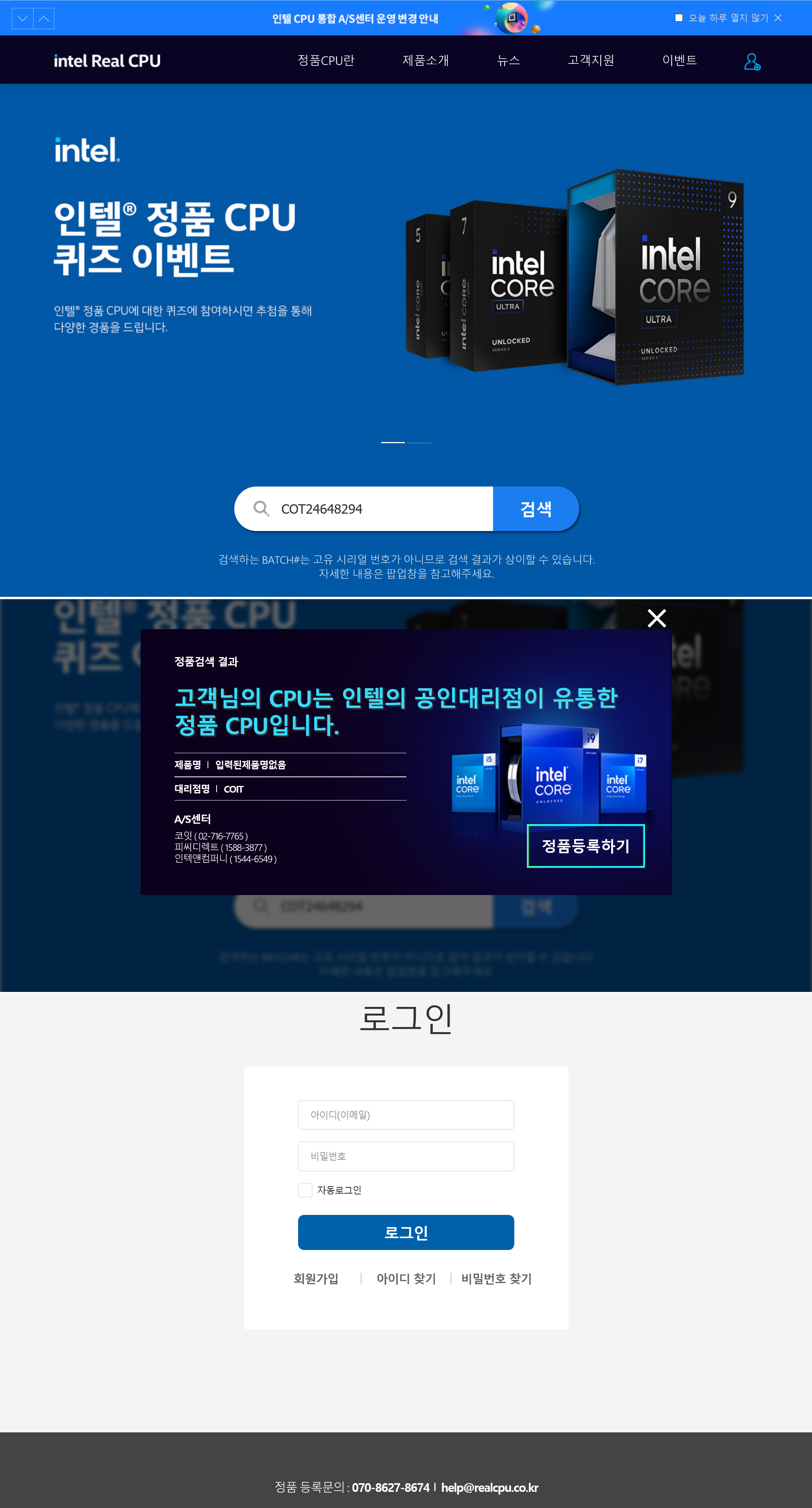 해당URL(https://www.realcpu.co.kr)에서 정품 바코드에 있는 PCD, INT, COT로 시작하는 11자리를 입력하고 검색을 누르면 정품 CPU라는 팝업이 뜹니다. [정품등록하기]를 누르면, 로그인 화면이 나오는데, 정품 등록을 진행하면 됩니다.