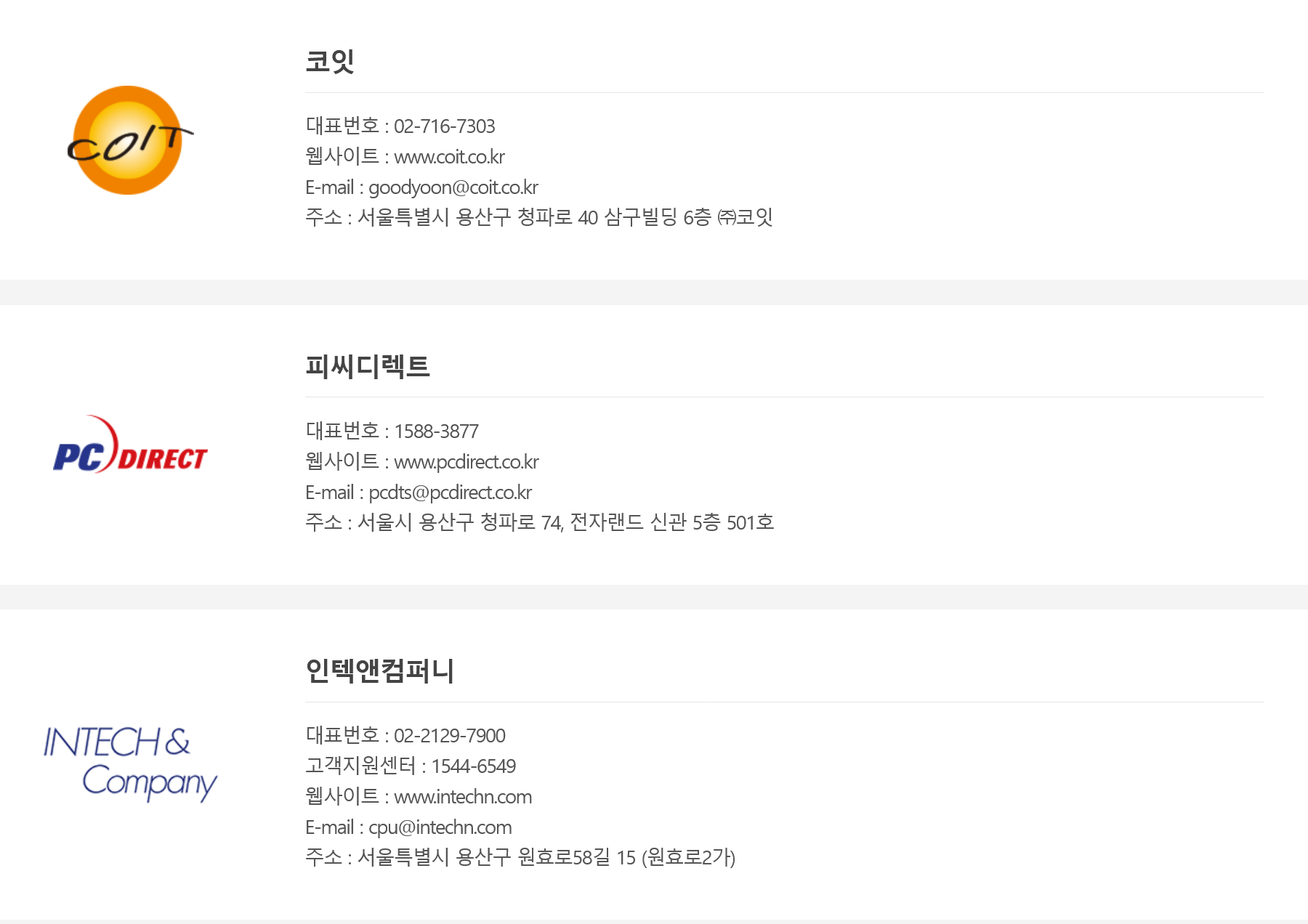 인텔 CPU의 한국 공식 대리점은 코잇, 피씨디렉트, 인텍앤컴퍼니 등 3곳 입니다.