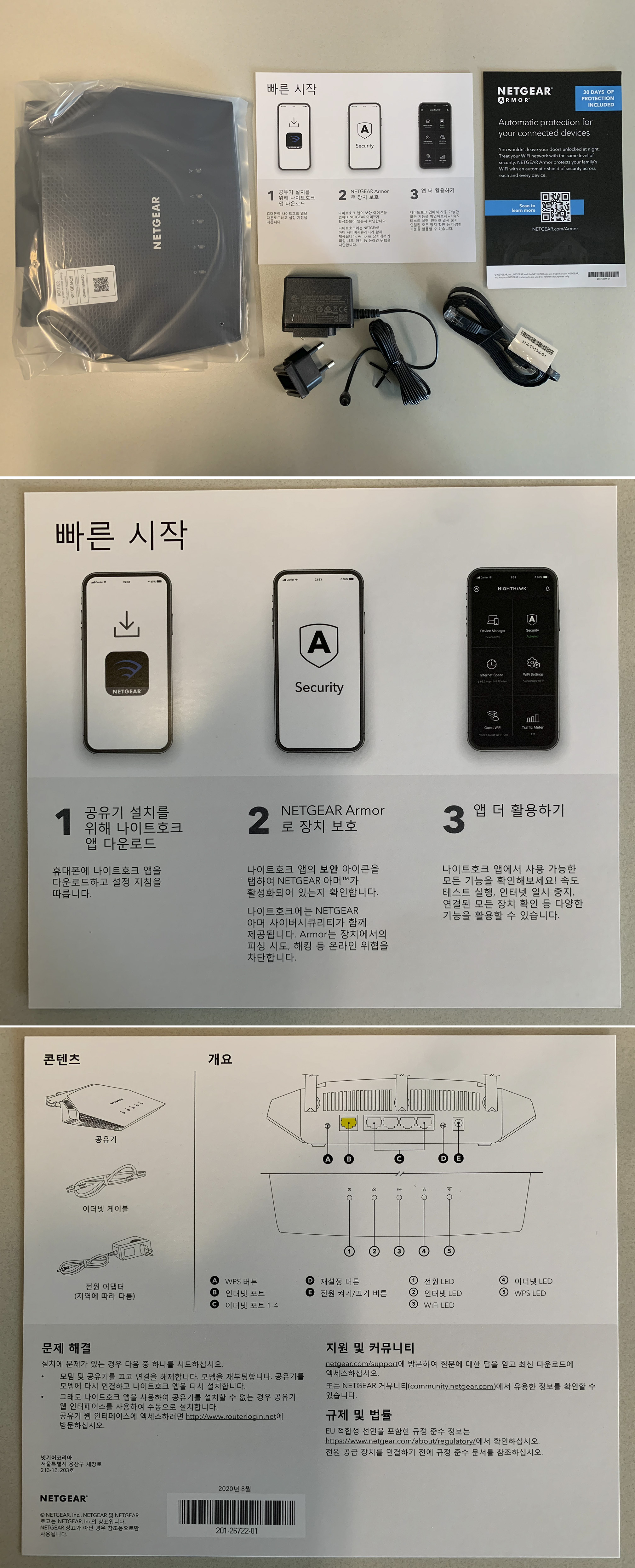 제품은 넷기어 RAX10 유무선공유기 본체, 사용자 가이드, 전원케이블, 랜 케이블로 구성되어 있습니다.