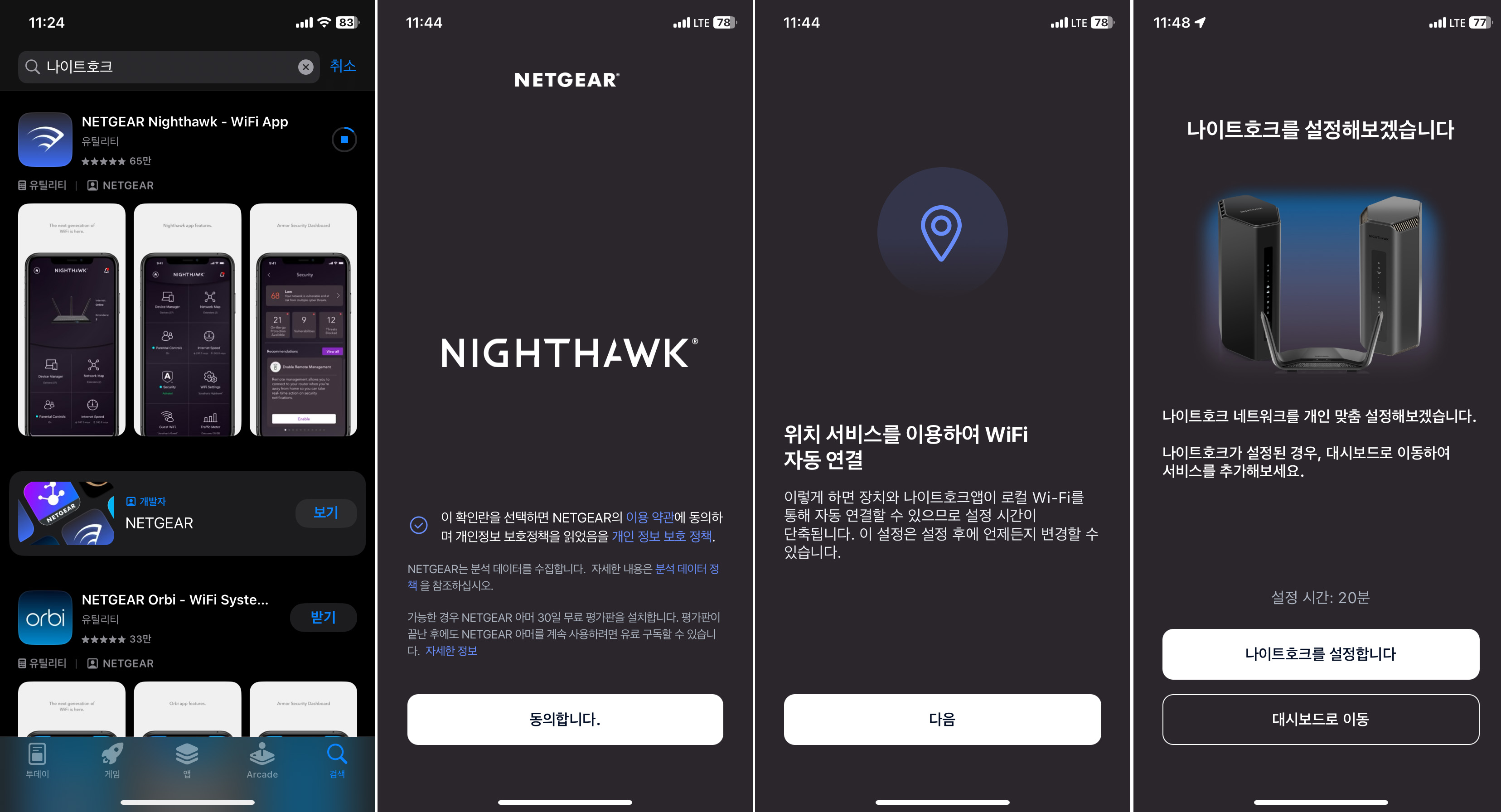 앱스토어에서 "나이트호크"로 검색하여 앱을 받을 수 있는데, 저는 아이폰을 사용하고 있어서, 애플 앱스토어에서 다운로드했습니다. 앱 설치 후 안내에 따라 공유기를 설정해보겠습니다.