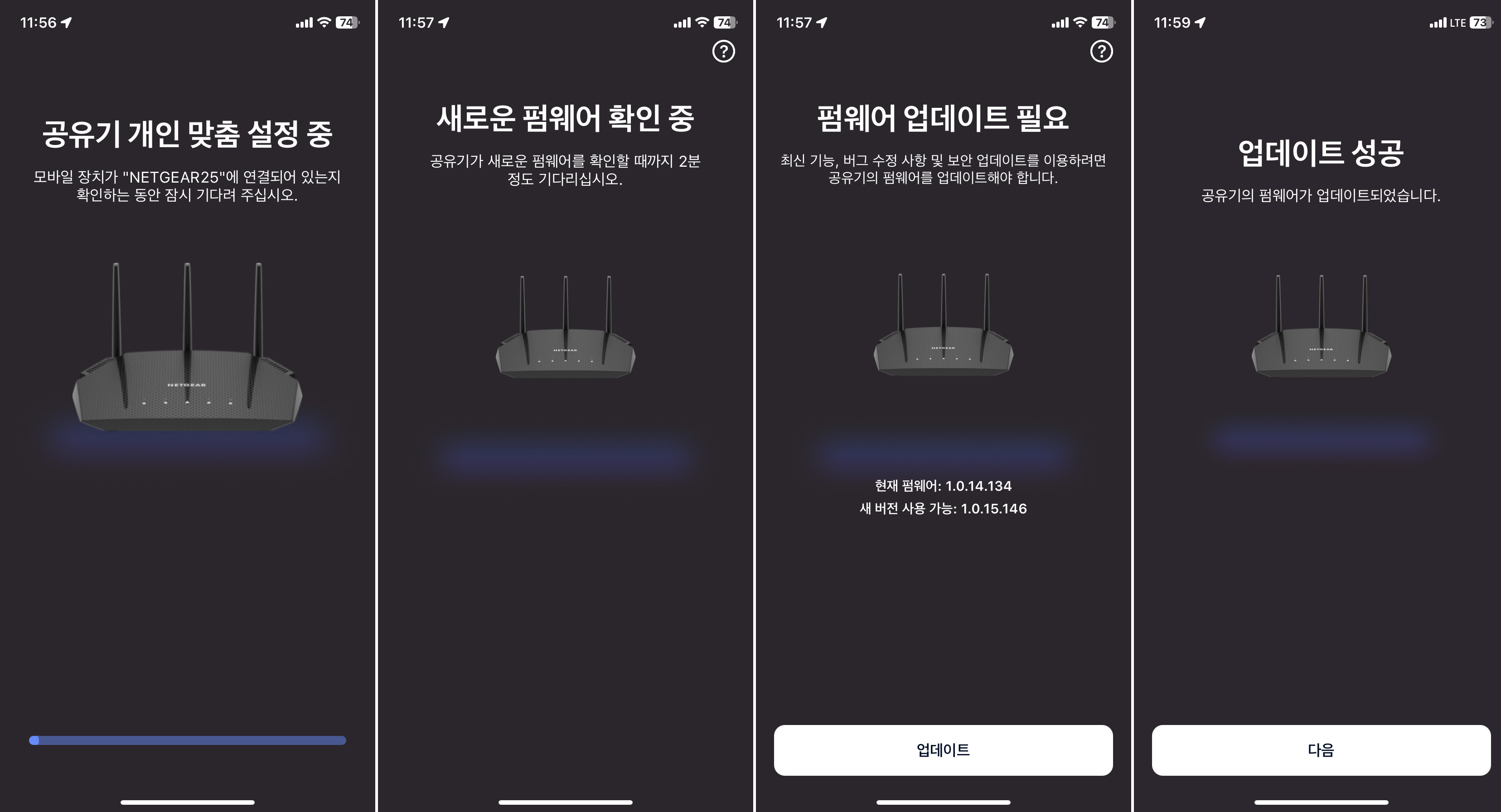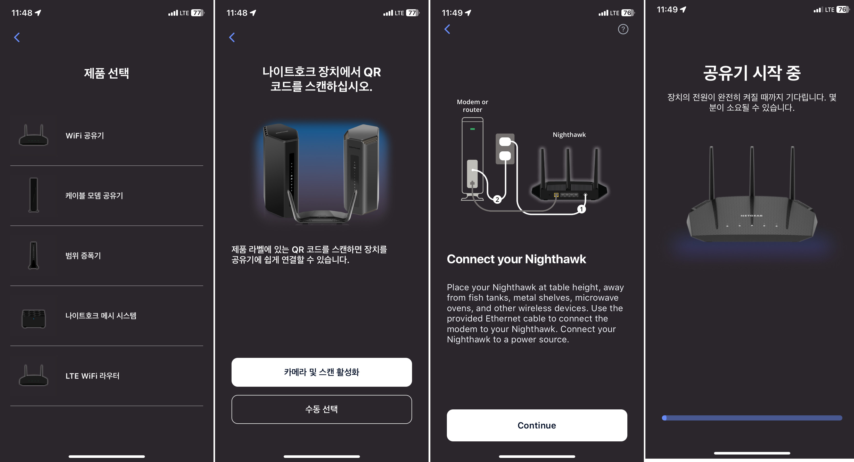 제품 선택을 하고, QR코드를 스캔하면 안내에 따라 몇 단계를 거치면 공유기 연결이 완료됩니다. 설정 중 새로운 펌웨어 업데이트가 자동으로 진행됩니다. (QR코드는 공유기에 있는 비닐에 부착되어 있습니다.)