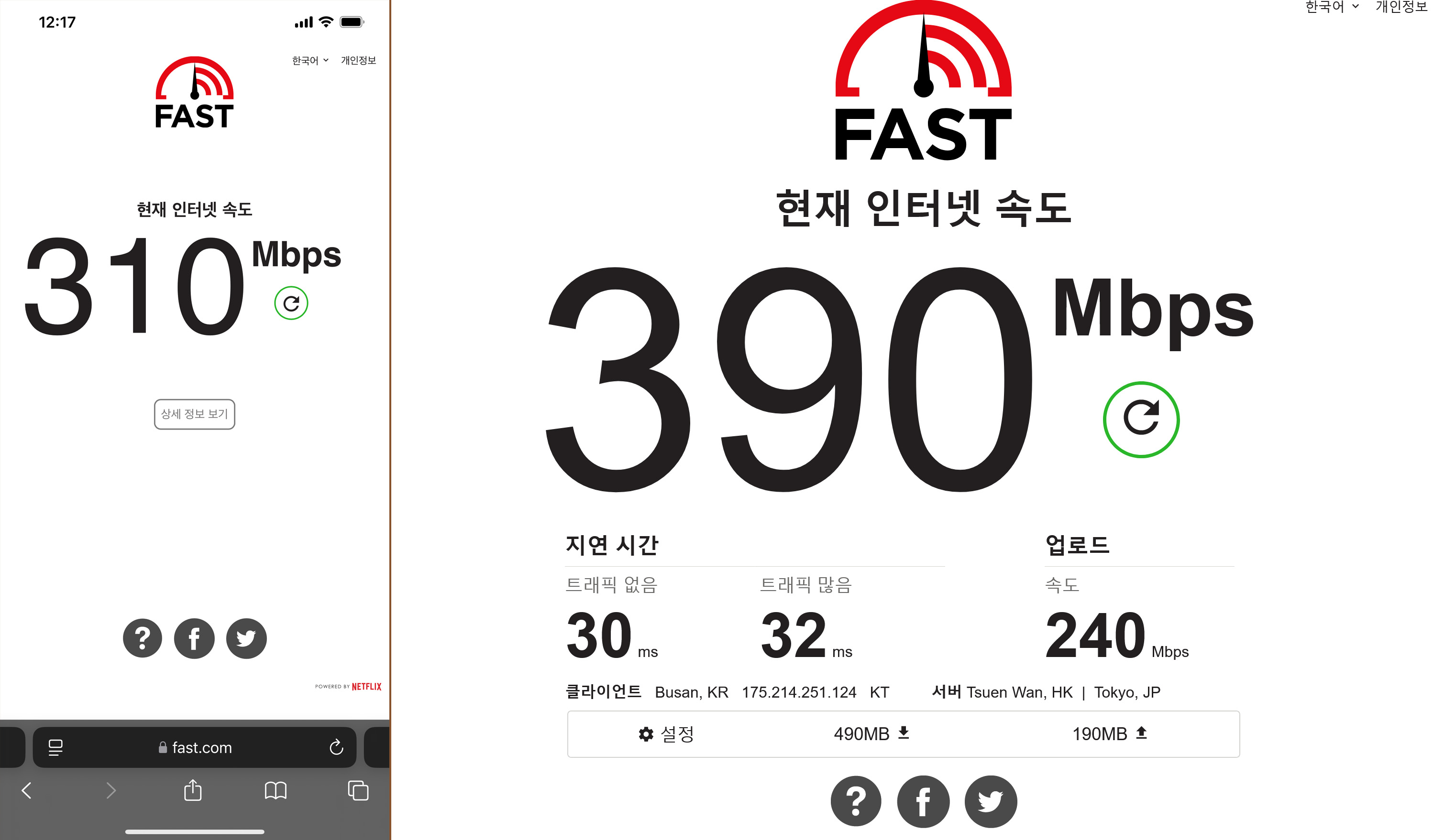 게스트로 접속한 아이폰과 PC를 사용하여, 인터넷 속도 테스트 사이트(https://fast.com)에서도 속도 측정 해보았습니다.