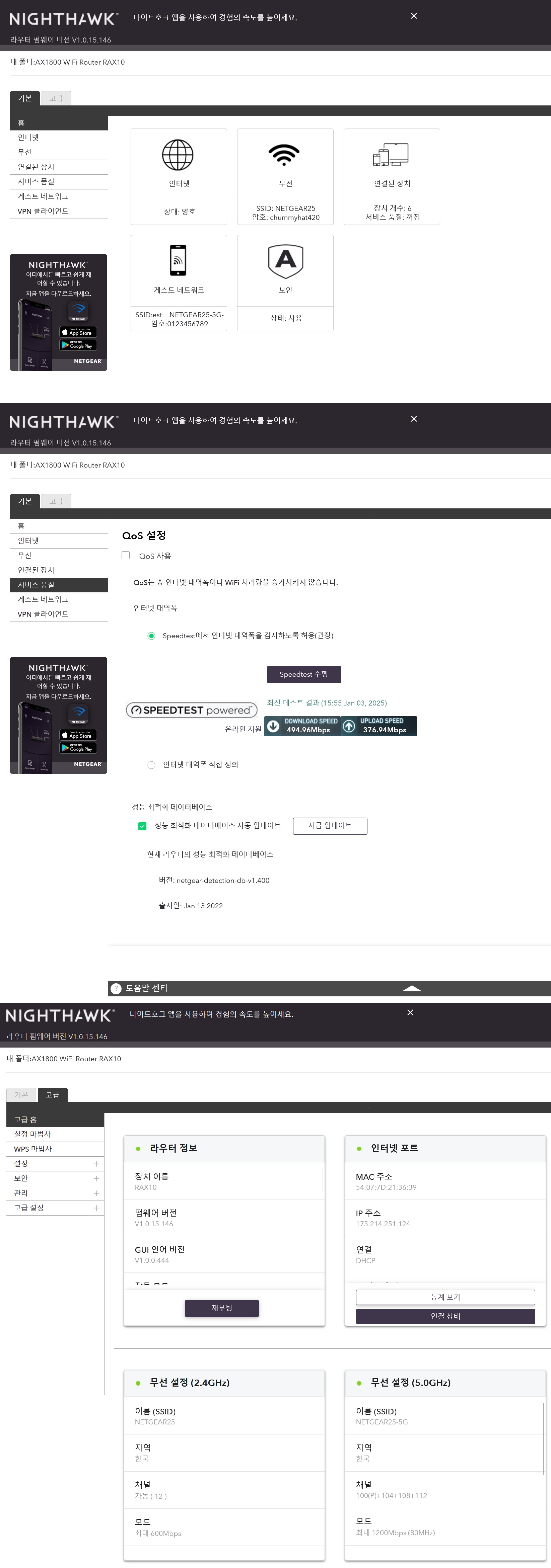 앱으로 공유기 설정이 완료되면, PC에서 나이트호크(http://routerlogin.net)에 접속이 가능하며, 앱에서의 설정처럼 동일하게 사용자가 원하는데로 설정할 수 있습니다. 저는 PC에서 접속했을때가 더 편하게 느껴졌습니다. PC에서도 속도 테스트를 해보았는데, 다운로드 494.96 Mbps, 업로드 376.94 Mbps로 아이폰보다 조금 더 높은 결과가 측정되었습니다.