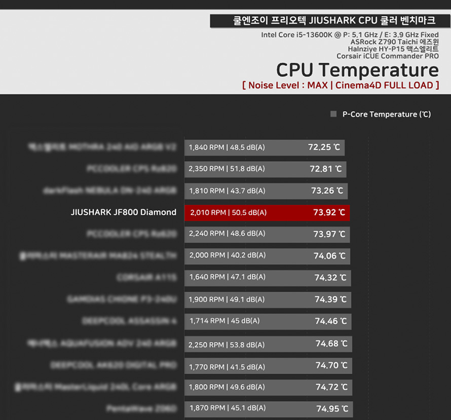 국내 IT커뮤니티 쿨엔조이에서 벤치마크 결과, 인텔 코어 i5-13600K 기준 최상위 쿨링 성능을 보증하는 점 참고하시길 바랍니다.