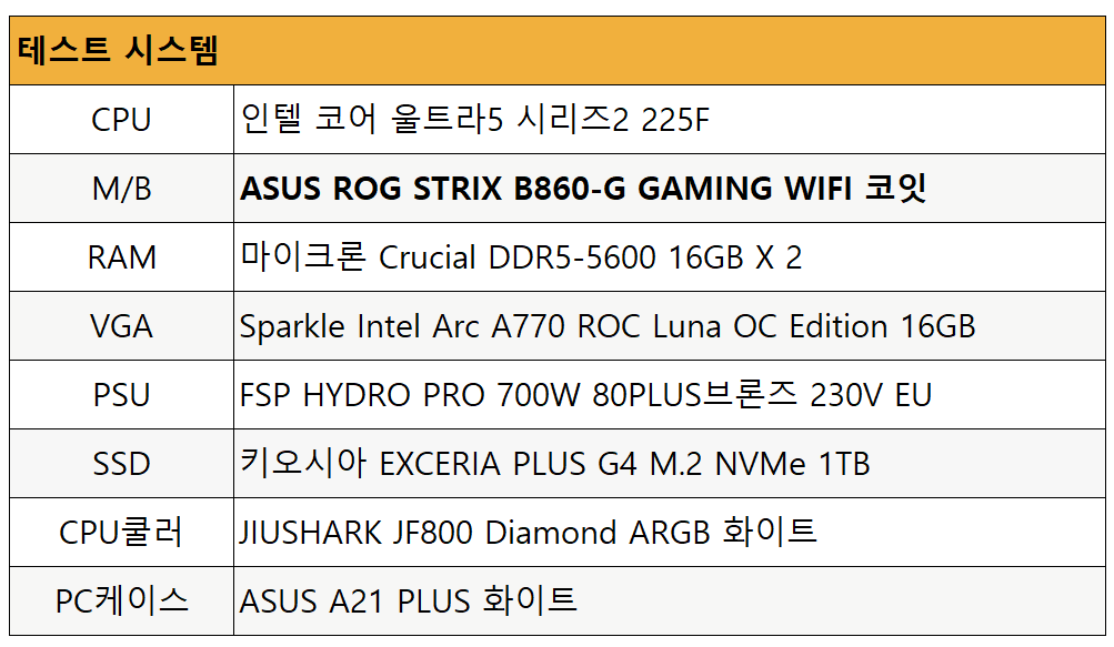 지금까지 ASUS ROG STRIX B860-G GAMING WIFI 코잇에 대해서 살펴보고, 인텔 코어 울트라5 225F와 함께 조립 및 각종 테스트를 진행해보았습니다.