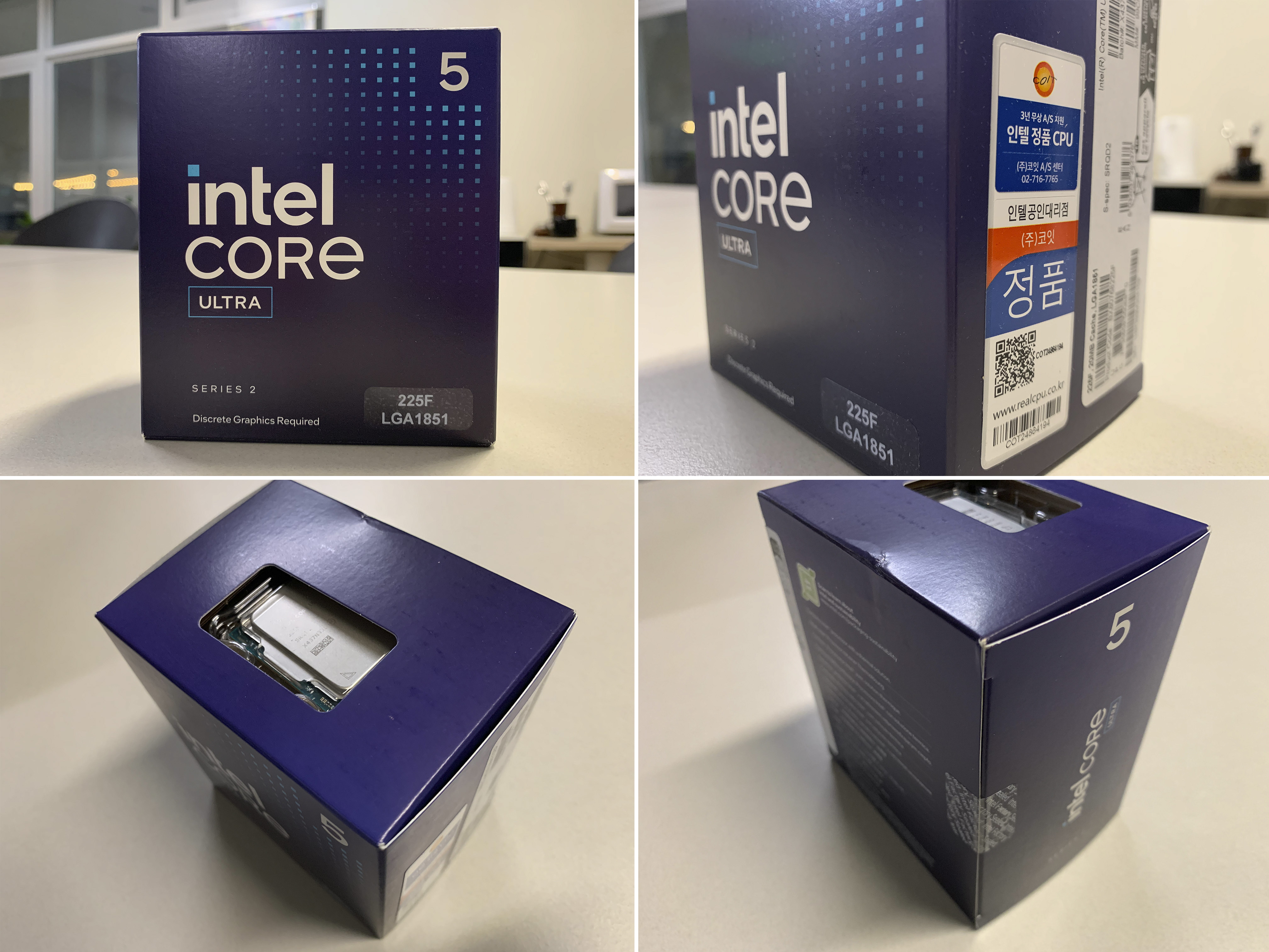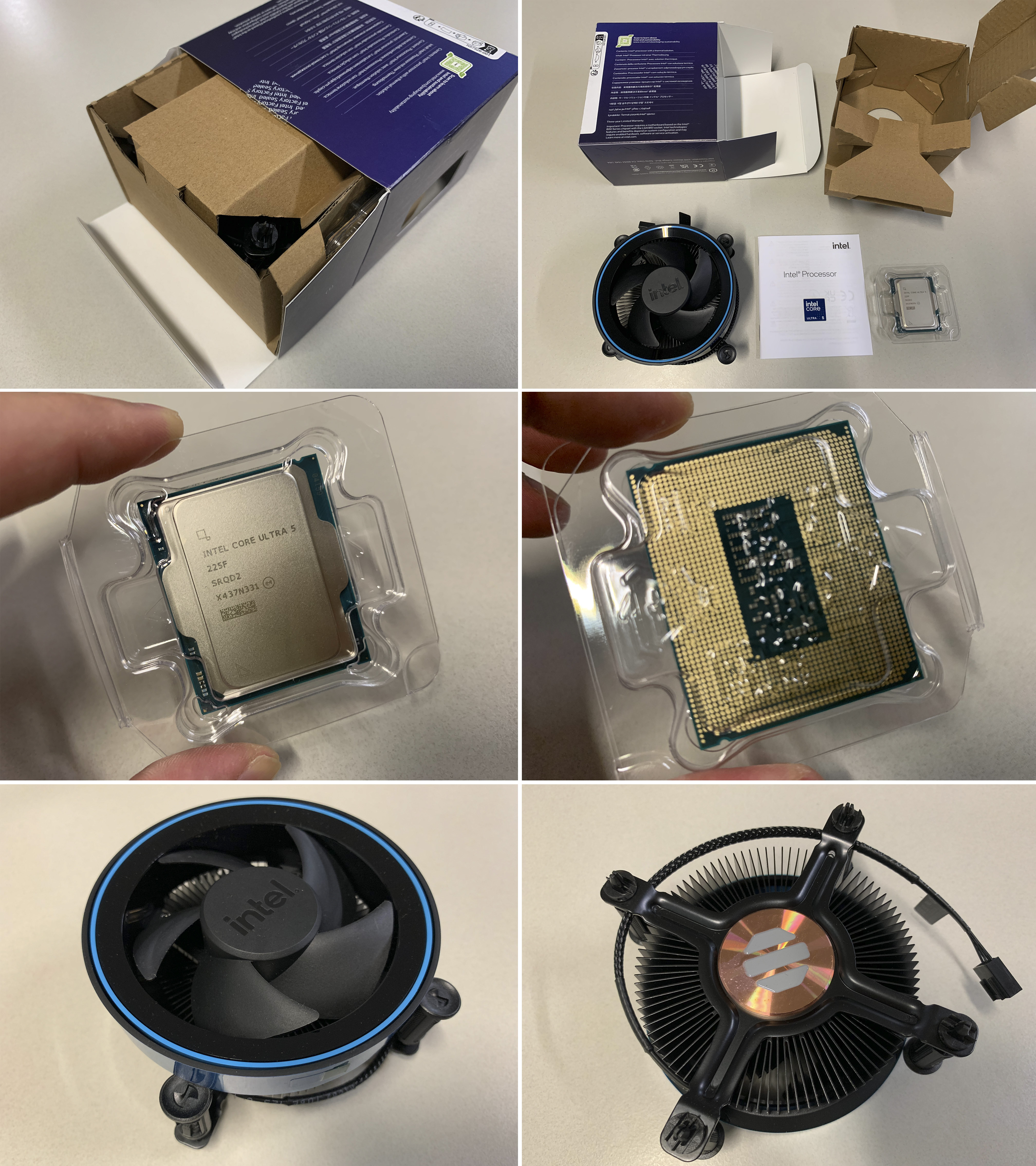 구성품은 인텔 코어 울트라2 225F CPU, 기본쿨러, 가이드 등이 있습니다.
