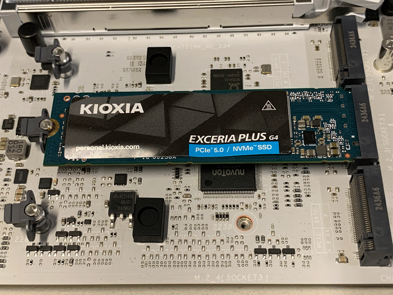 SSD 히트싱크를 열고, 키오시아 EXCERIA PLUS G4 M.2 NVMe 1TB를 설치합니다. 도구없이 손으로만 조립이 가능해서 편리합니다.