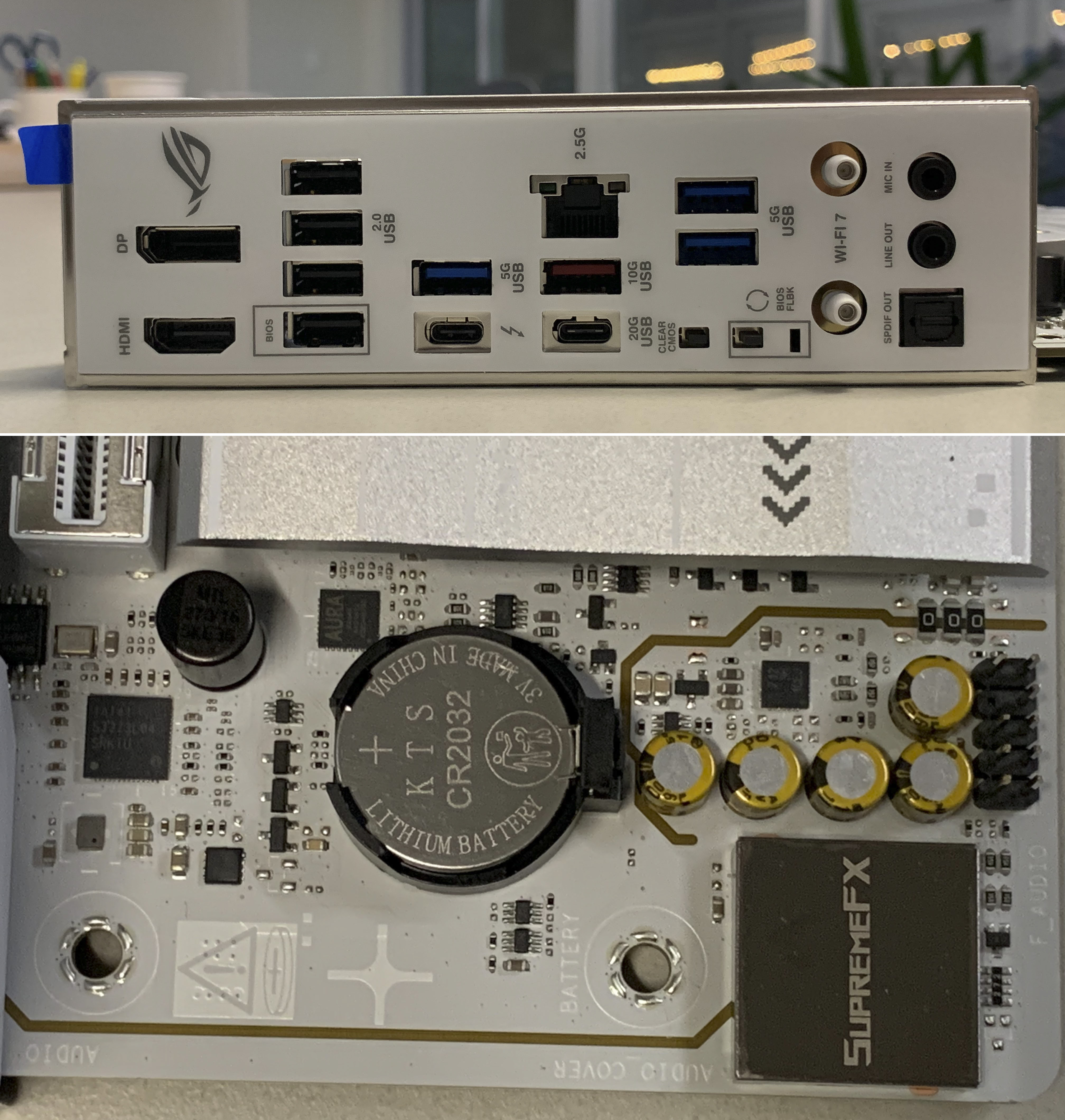 사진의 왼쪽부터 HDMI 포트, DP 포트, USB2.0 Type-A 4개, USB Type-C(썬더볼트4), USB Type-A 3개(파란색 5Gbps), USB Type-C(20Gbps), USB Type-A 1개(빨간색 10Gbps), 인텔 2.5Gbe Lan, Clear CMOS 버튼, BIOS 플래쉬백 버튼, WiFi 7 안테나 커넥트, 옵티컬 S/PDF 출력 포트, 오디오 잭 2개 등이 있습니다. M-ATX 메인보드이지만 확장성이 아주 좋습니다. 리얼텍 ALC1220P 코덱 + 사비텍 SV3H712 앰프가 탑재되어 있습니다.