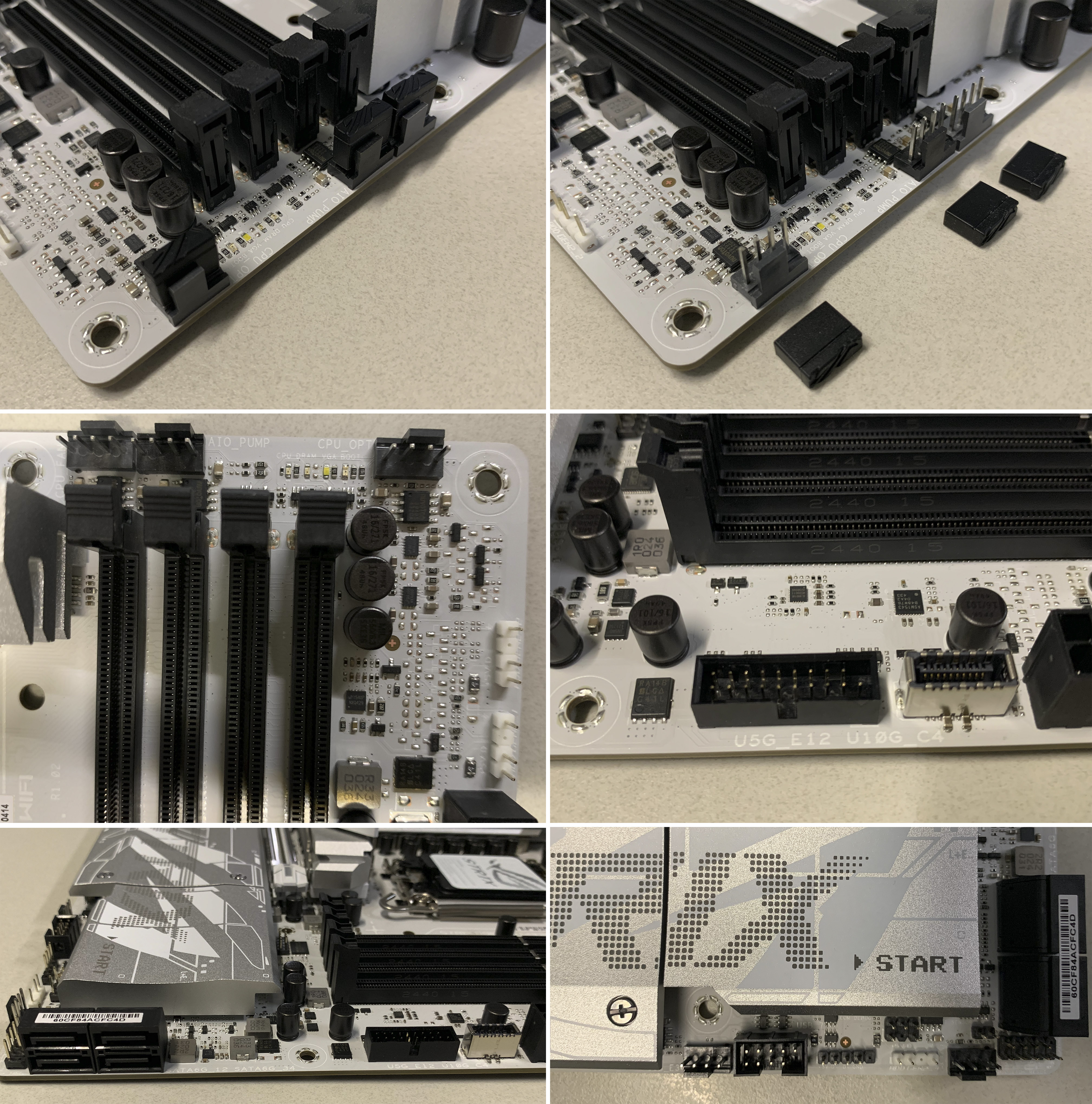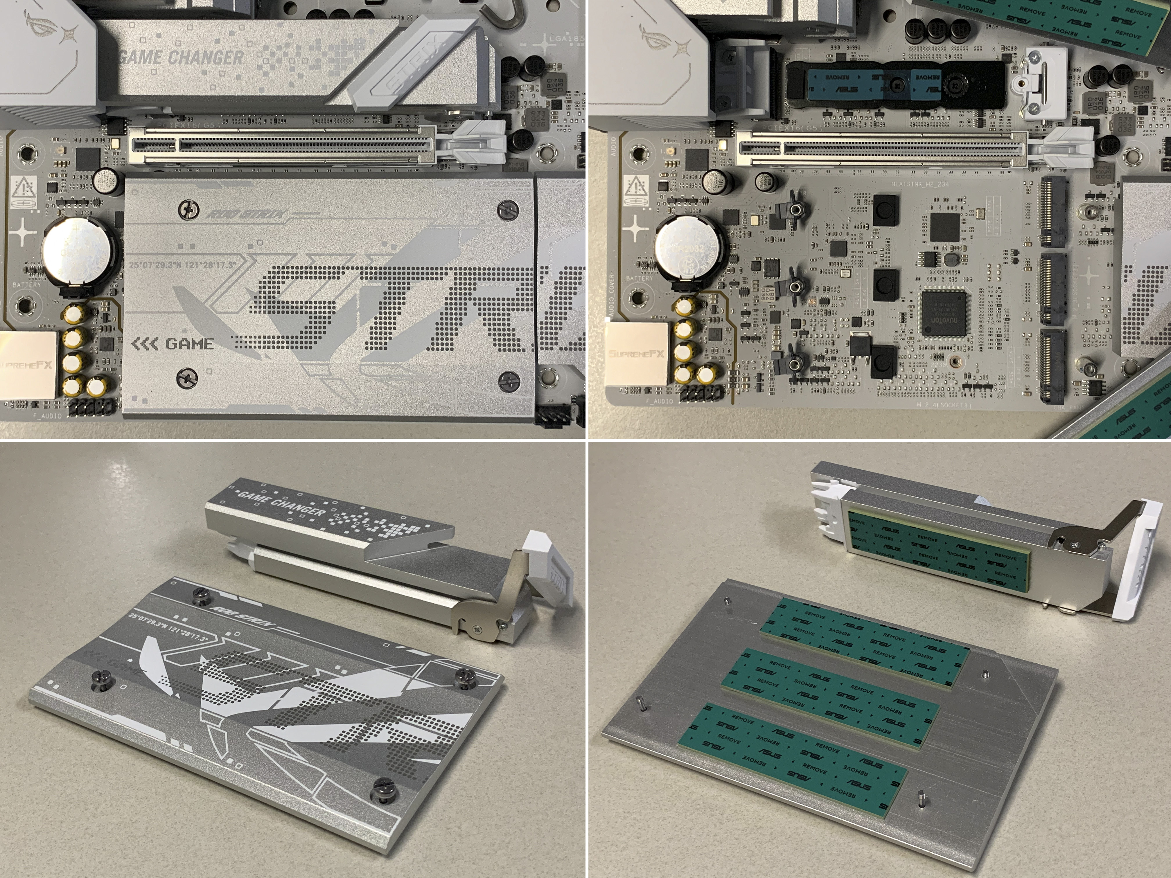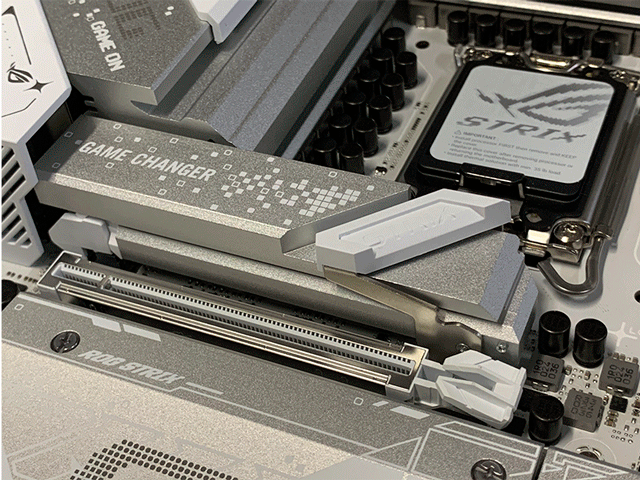 메인보드 거의 전체를 덮은 듬직한 히트싱크가 보기만 해도 시원한 쿨링이 기대됩니다. 화이트 색상의 PCB와 ROG 로고가 있는 히트싱크가 너무 잘 어울리네요. 칩셋을 제외하고, 램 슬롯을 제외하고 모든 부품이 화이트 색상인 점이 인상적입니다.