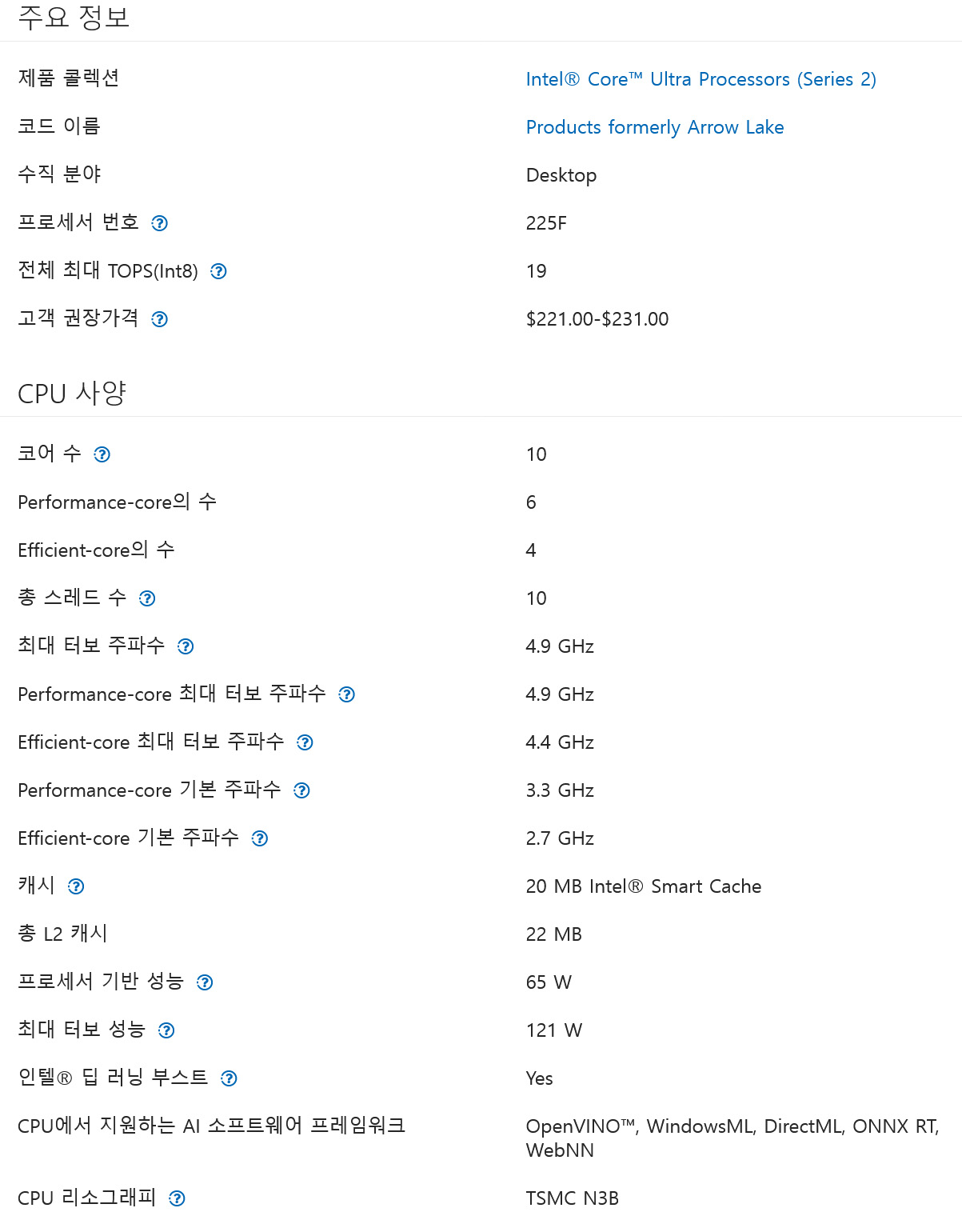 인텔 코어 울트라5 시리즈2 225F (애로우레이크) : https://prod.danawa.com/info/?pcode=74123111