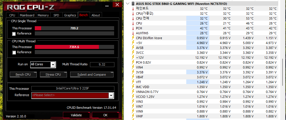 벤치테스트 실행시, 싱글은 789.2점, 멀티는 7351.5점이 측정되었습니다.