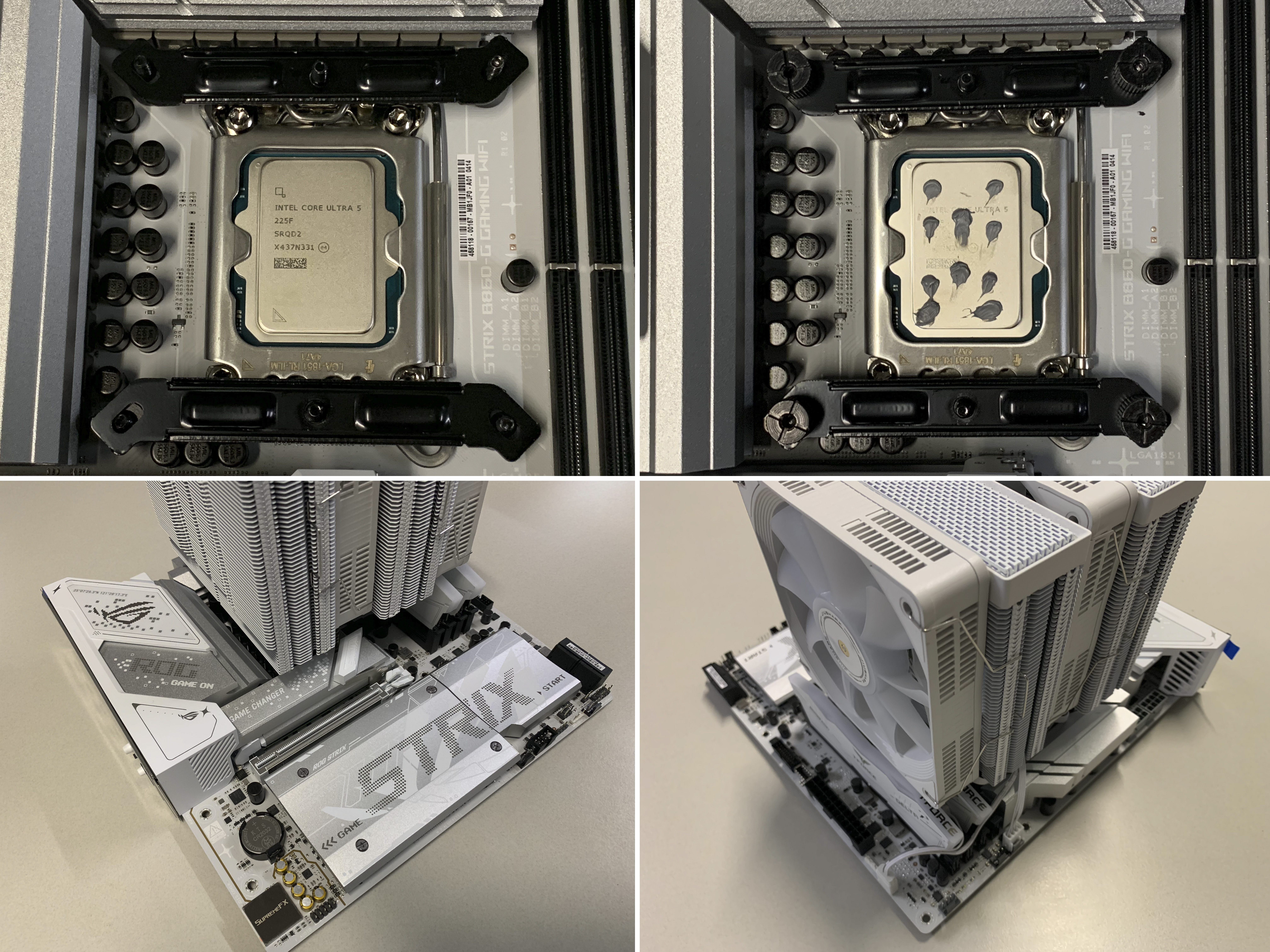 이번 인텔코어 울트라5 225F는 뛰어난 전력 효율이 특징으로 온도가 높지 않을거라 판단되지만, 기본쿨러가 아닌 JIUSHARK JF800 Diamond ARGB 화이트를 사용했습니다. 써멀구리스 도포 및 공랭쿨러를 설치합니다.