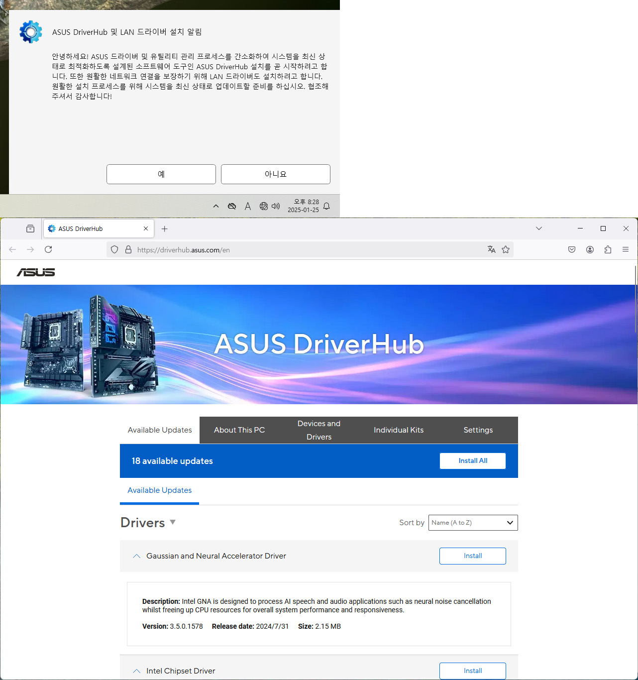 윈도우를 설치 후 부팅하면 ASUS DriverHub 및 LAN 드라이버 설치 알림이 우하단 팝업으로 뜨는데 그대로 설치를 진행하면 시스템에 필요한 드라이버와 소프트웨어를 손쉽게 설치할 수 있게 도와줍니다.