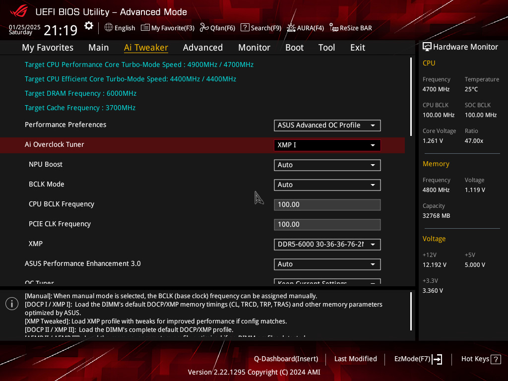 기본으로 설정된 Intel Default Settings에서 ASUS Advanced OC Profile 변경, 램 프로파일인 XMP 6000으로 설정했습니다.