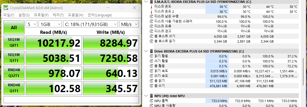키오시아 EXCERIA PLUS G4 M.2 NVMe 1TB 제품을 대상으로 크리스탈디스크마크로 실행한 결과입니다.
