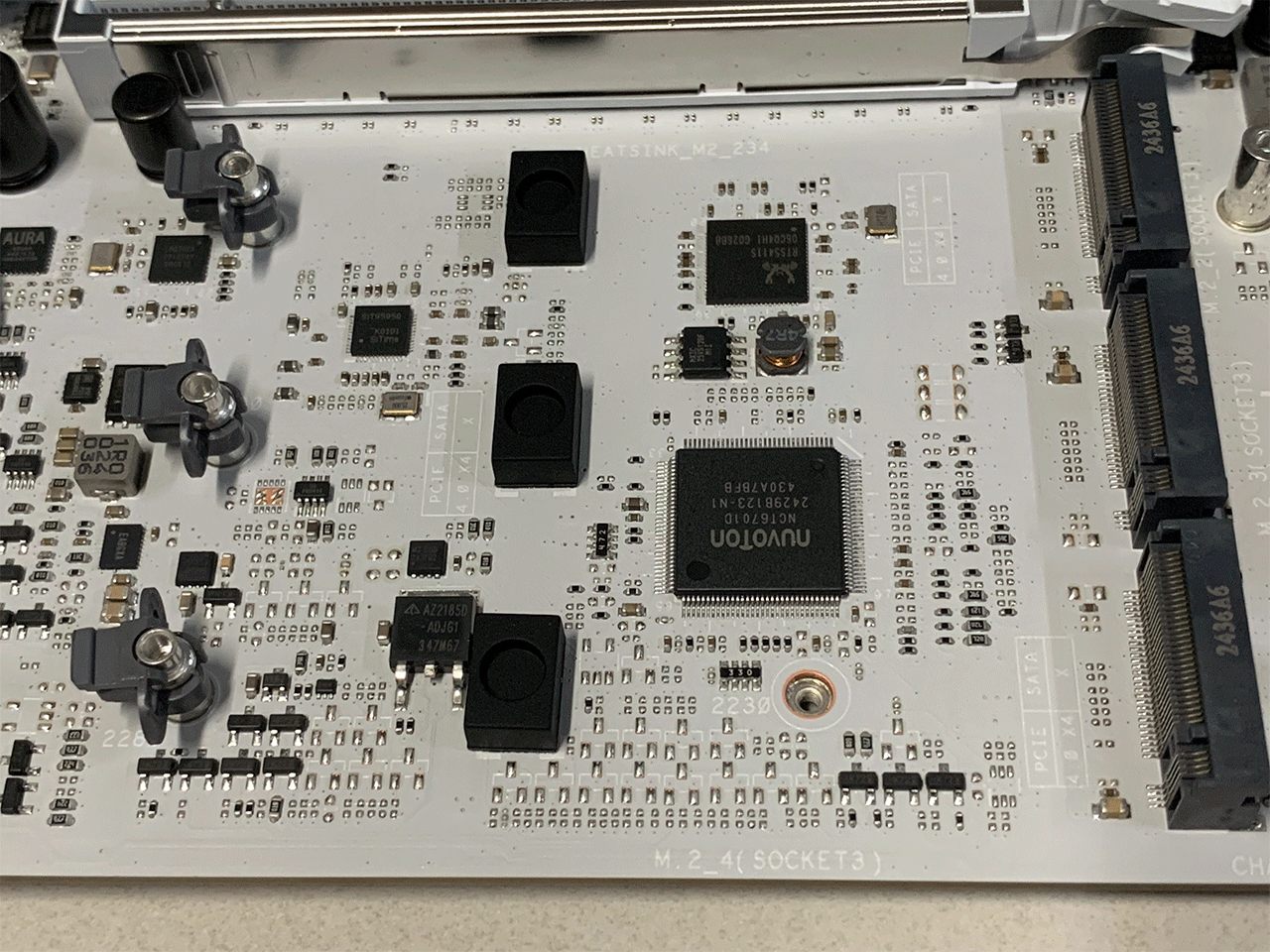 M.2 NVMe SSD는 총 4개를 지원하며, 운영체제를 설치할 메인(윗)슬롯은 바닥에 세워질 만큼 듬직한 히트싱크는 온도 걱정이 필요 없을 정도로 안심이 됩니다. 첫번째 슬롯 M.2 슬롯은 고정나사가 완전히 사라지도록 개선되어 손으로 M.2 SSD를 손쉽게 장착 및 탈착이 가능하도록 설계되어, 나중에 M.2 SSD 업그레이드시 편하게 교체가 가능하겠습니다.