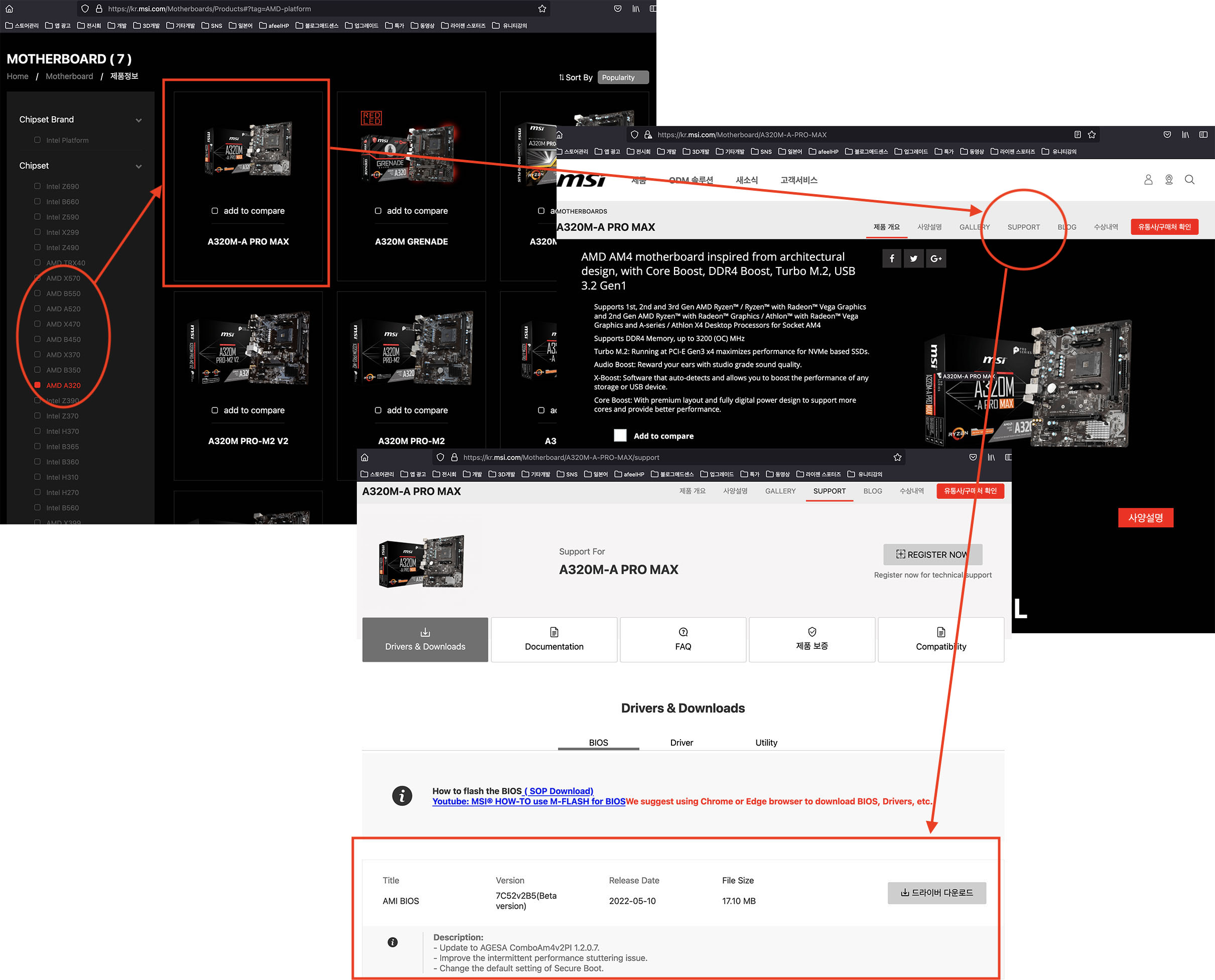 A320과 B350 메인보드에서 바이오스 다운 받는 방법입니다. 방법이 같습니다.
