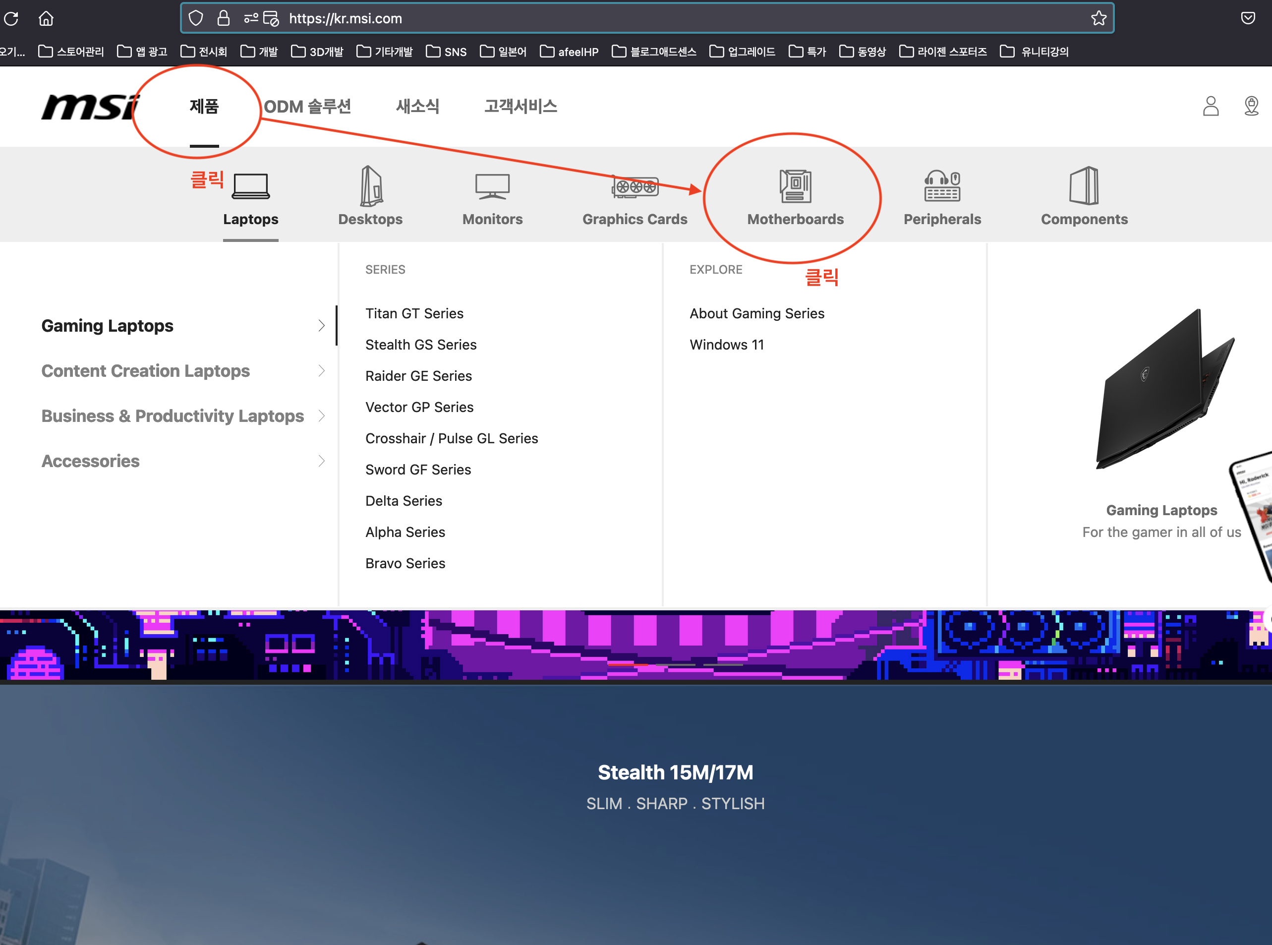 그림과 같이 홈페이지에서 메인보드 화면을 선택합니다. https://kr.msi.com/