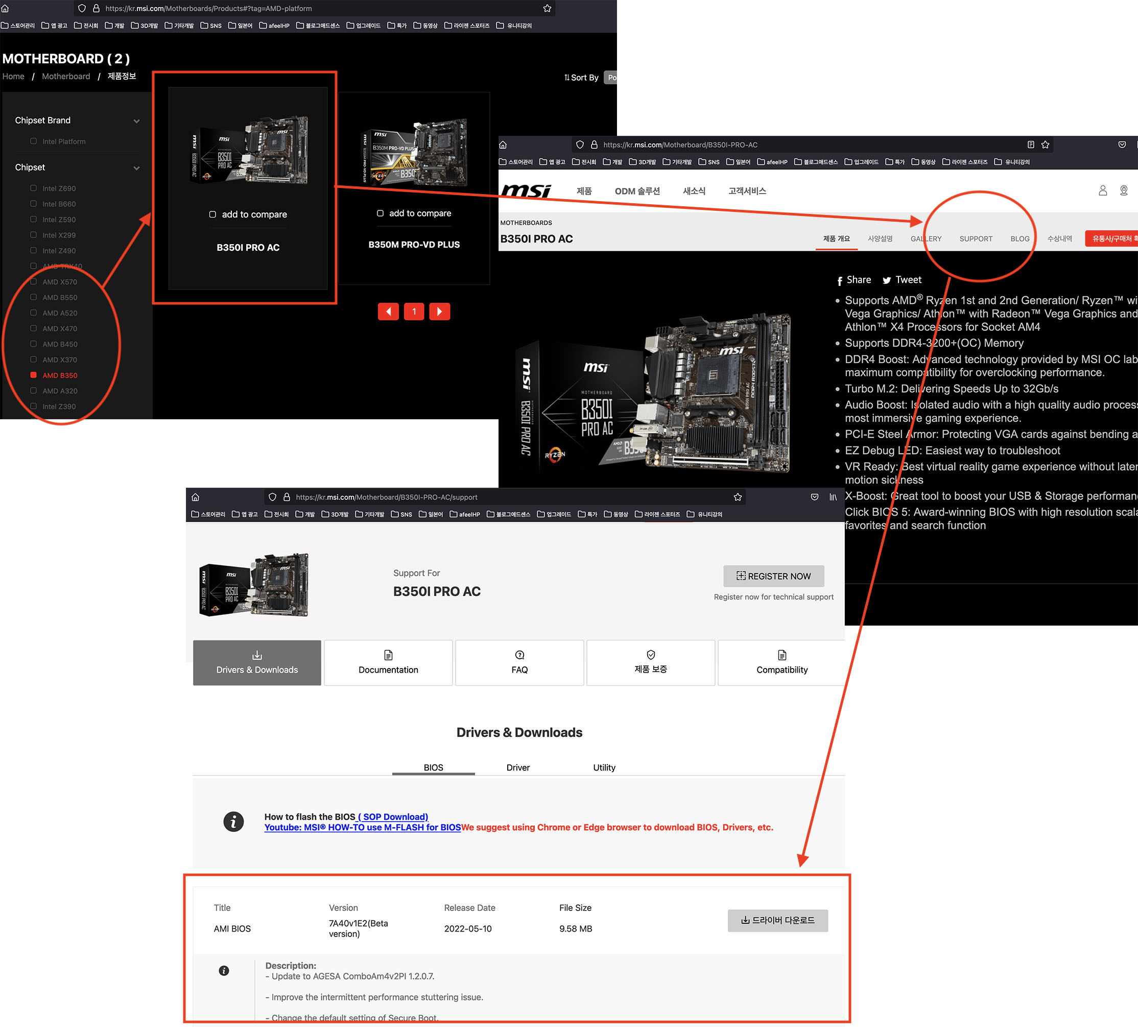 B350 모델의 바이오스를 다운 받는 스크린샷입니다