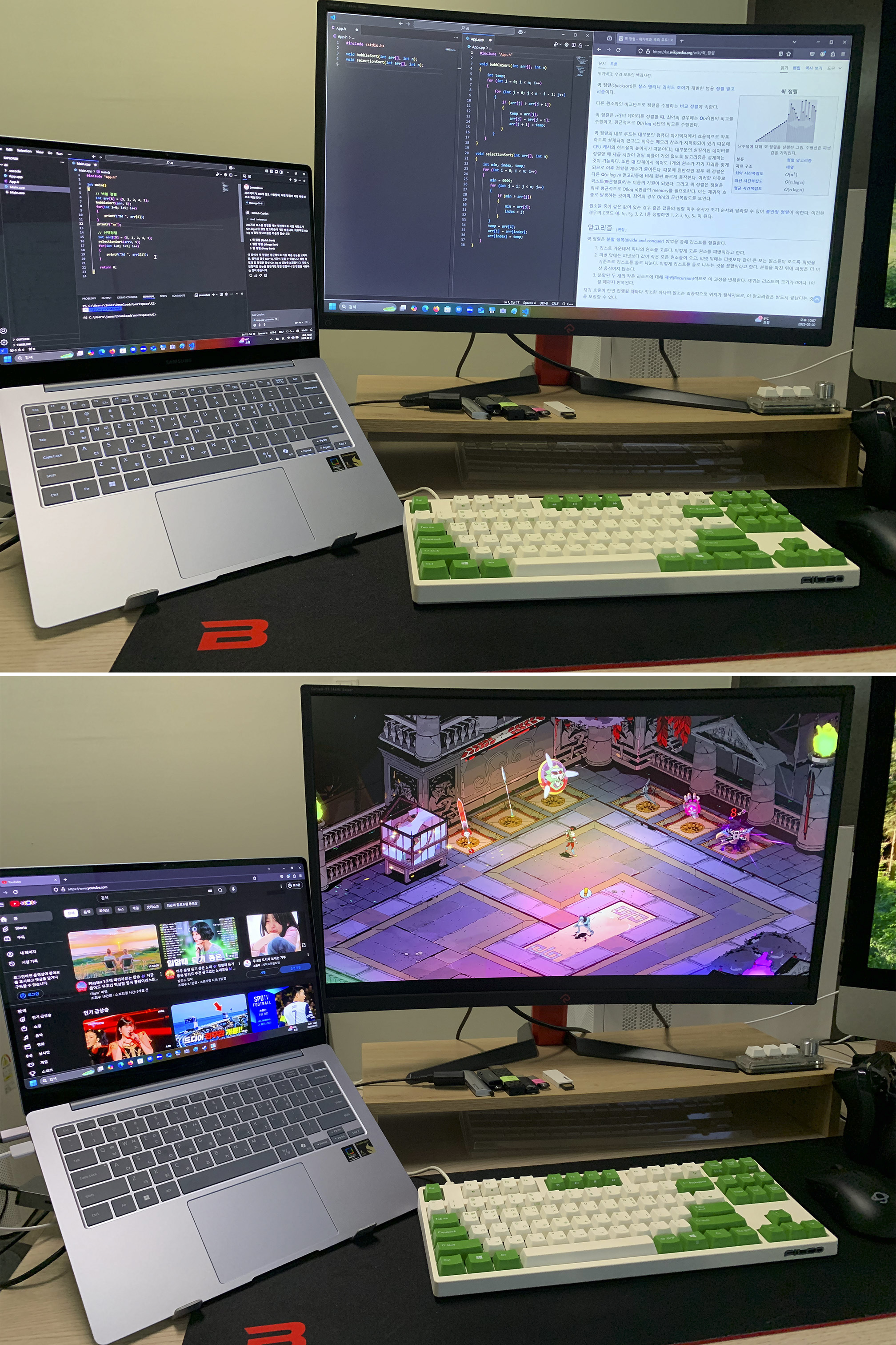 스냅드래곤(Snapdragon) X Elite 프로세서의 뛰어난 성능으로, 사무실에서는 멀티허브로 모니터, 키보드, 마우스로 연결해서 개발용 데스크탑용으로 사용하기에도 괜찮고, 키보드와 마우스의 연결로 게이밍 노트북으로도 좋았습니다.