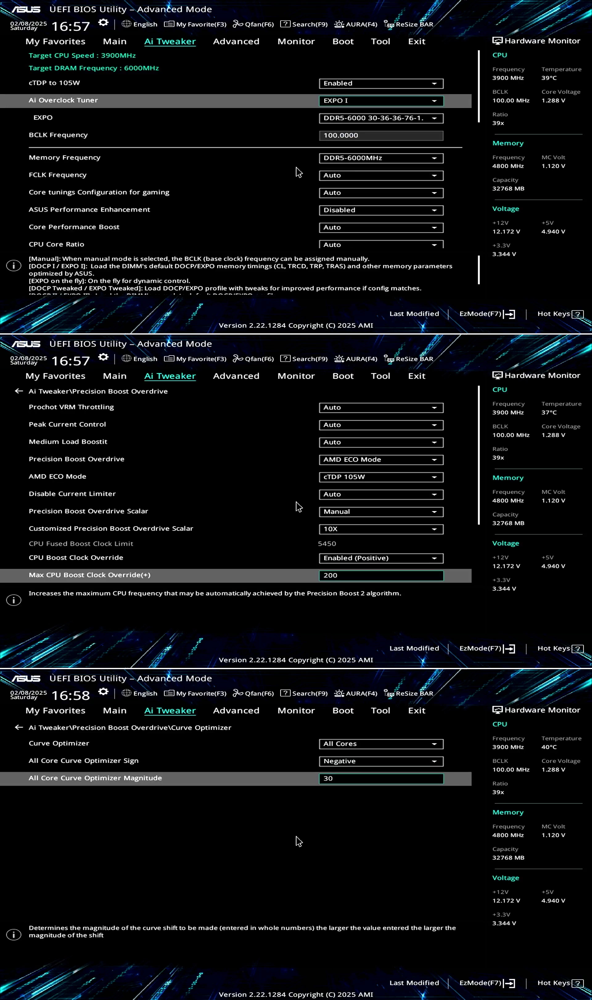 Precision Boost Overdrive Scalar Manual 및 10X, CPU Boost Clock Override +200, Curve Optimizer All Core -30(라이젠 마스터 프로그램을 통해서 구해온 값)을 설정합니다. 사용하는 CPU 수율에 따라 이 값은 다르니 반드시 라이젠 마스터로 값을 구해서 입력하시는걸 추천합니다.