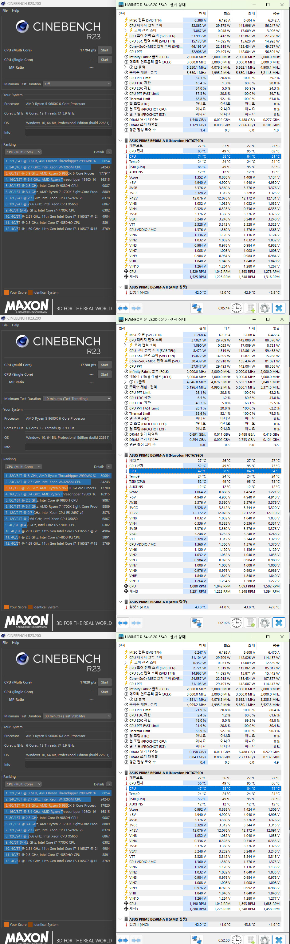 - 최대 클럭 5.4GHz, 6코어 12레드의 라이젠5 9600X의 조합으로 Cinebench R23에서, 상위 CPU인 라이젠7 7700의 멀티 성능보다 조금 부족할 만큼, 100% 이상의 성능을 뽑아줄 좋은 결과가 측정되었습니다. 또한 30분이상 풀로드(과부하) 상태에서도 성능 저하는 전혀 없을 만큼 아주 안정적이었습니다. 여러 벤치 프로그램 실행해서도 동일했는데, 라이젠7 9700X에서도 무난하게 사용할 수 있을 것으로 예상될 만큼 성능이 좋은 메인보드입니다.