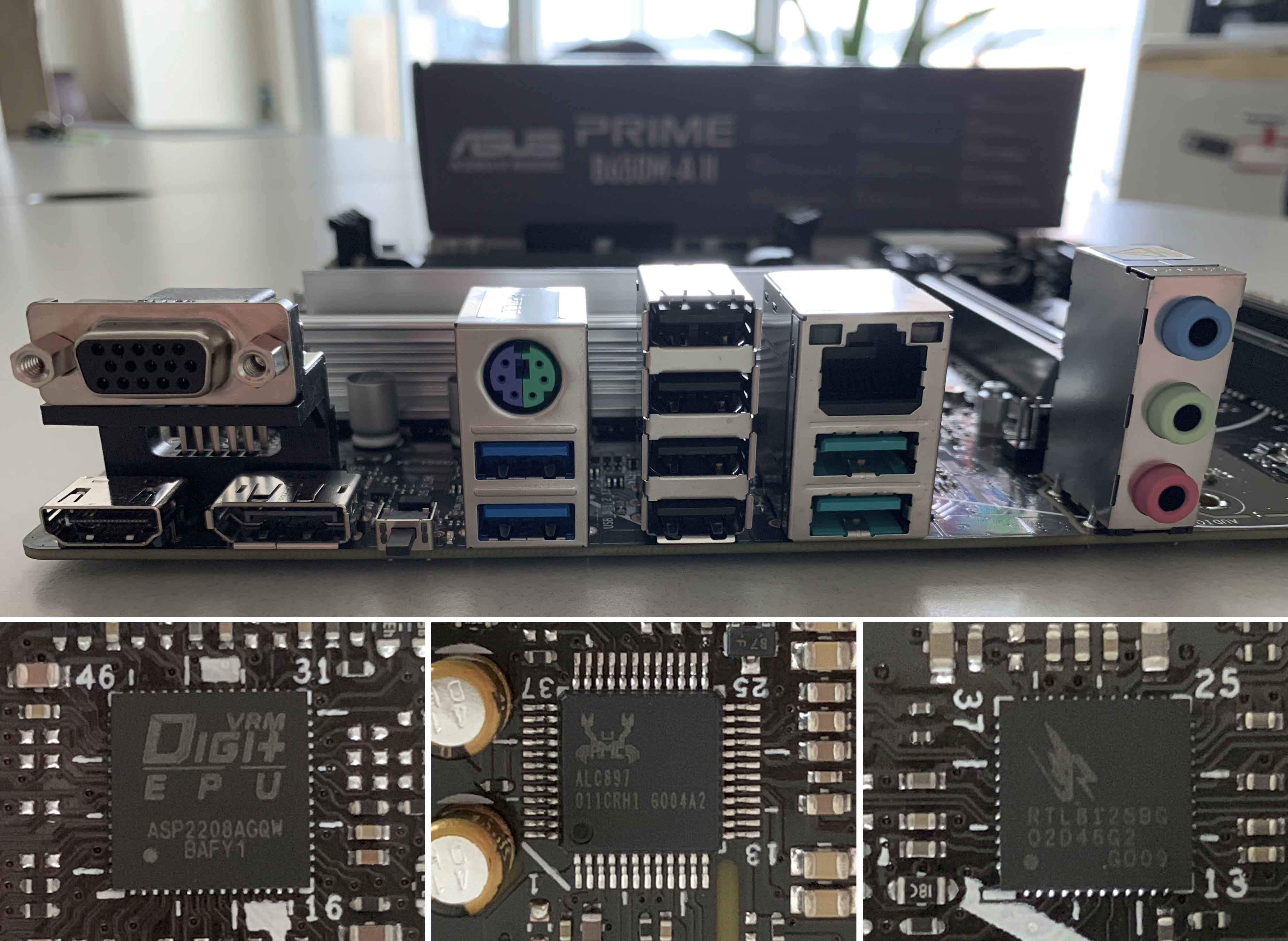 왼쪽에서 부터 HDIM / VGA / DP 포트, BIOS 플래시백 버튼, USB3.2 Gen1 Type-A 2개(파란색), PS/2, USB2.0 Type-A 4개(검정색), USB3.2 Gen2 Type-A 2개(청록색), 2.5Gbps 랜(Realtek RTL8125BG), 오디오 포트(Realtek ALC 897 최대 24비트/192kHz 재생을 지원) 등이 있습니다.