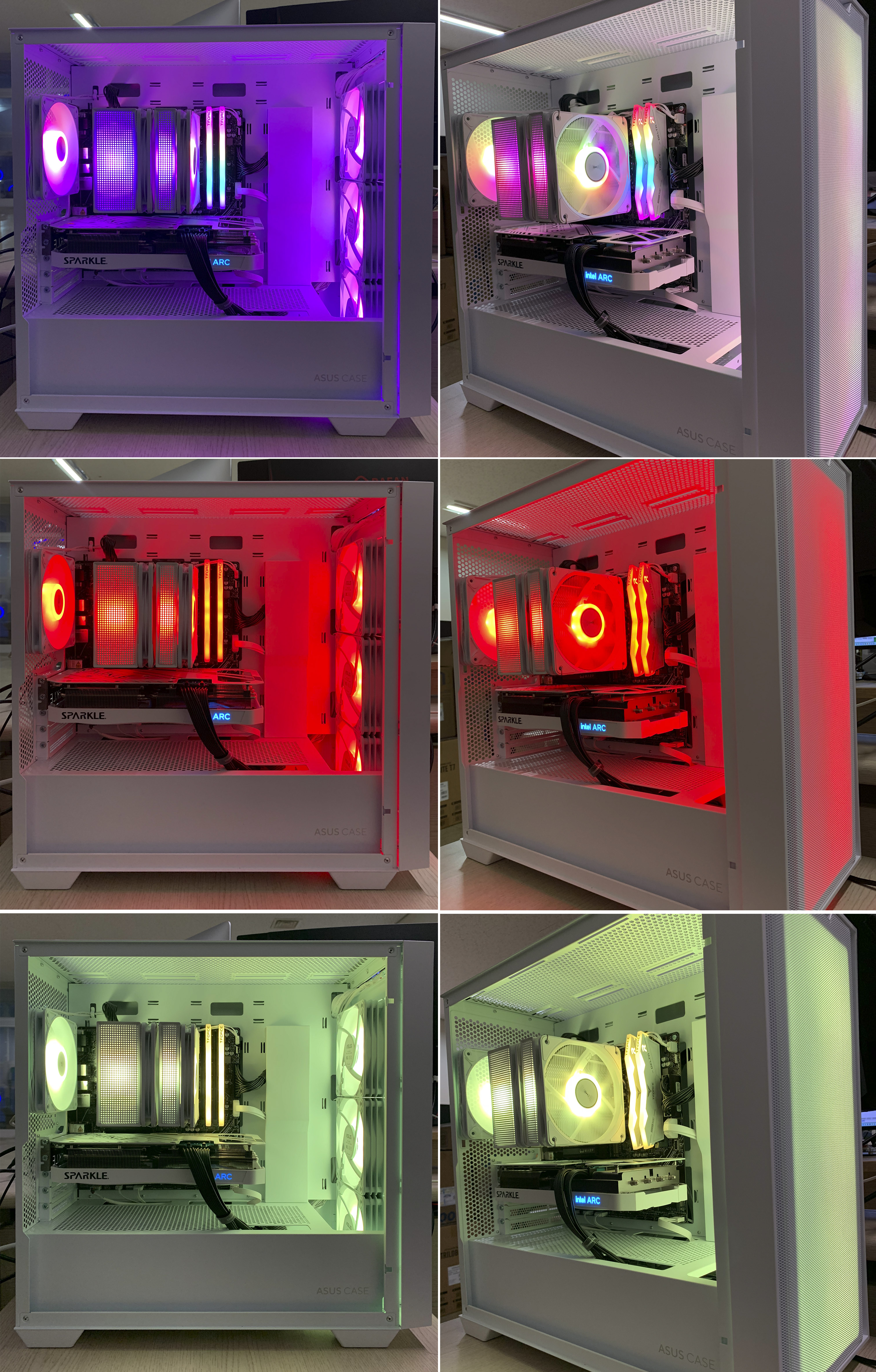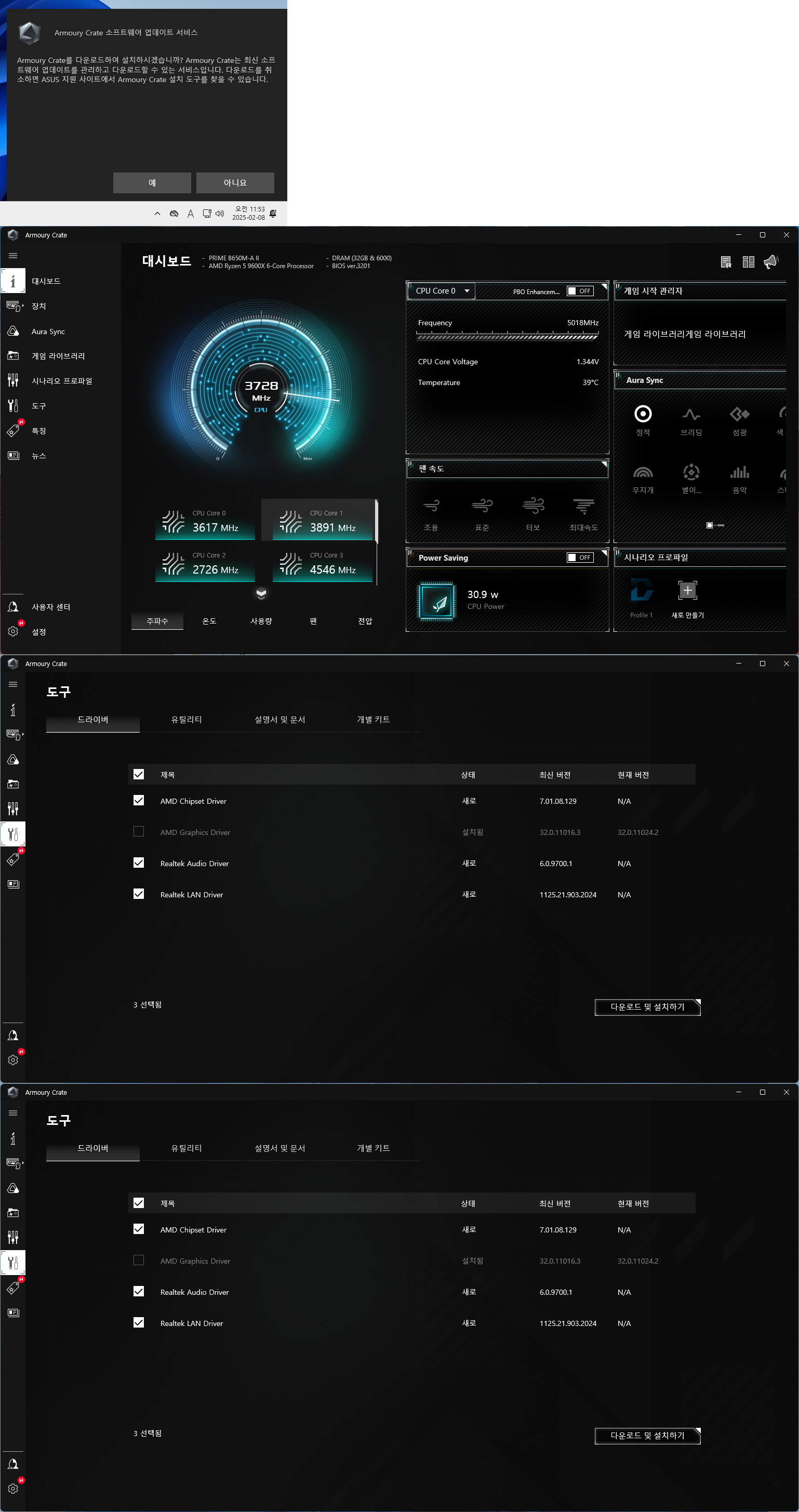 시스템 부팅후 윈도우로 진입하면 오른쪽 하단에 Armoury Crate 소프트웨어 설치 안내문 팝업이 뜨는데 안내에 따라 설치하면, 드라이버 업데이트 등의 편의 기능을 제공 받을 수 있으며 LED 모드와 컬러 설정을 변경하여 시스템을 취향에 따라 튜닝할 수 있습니다.