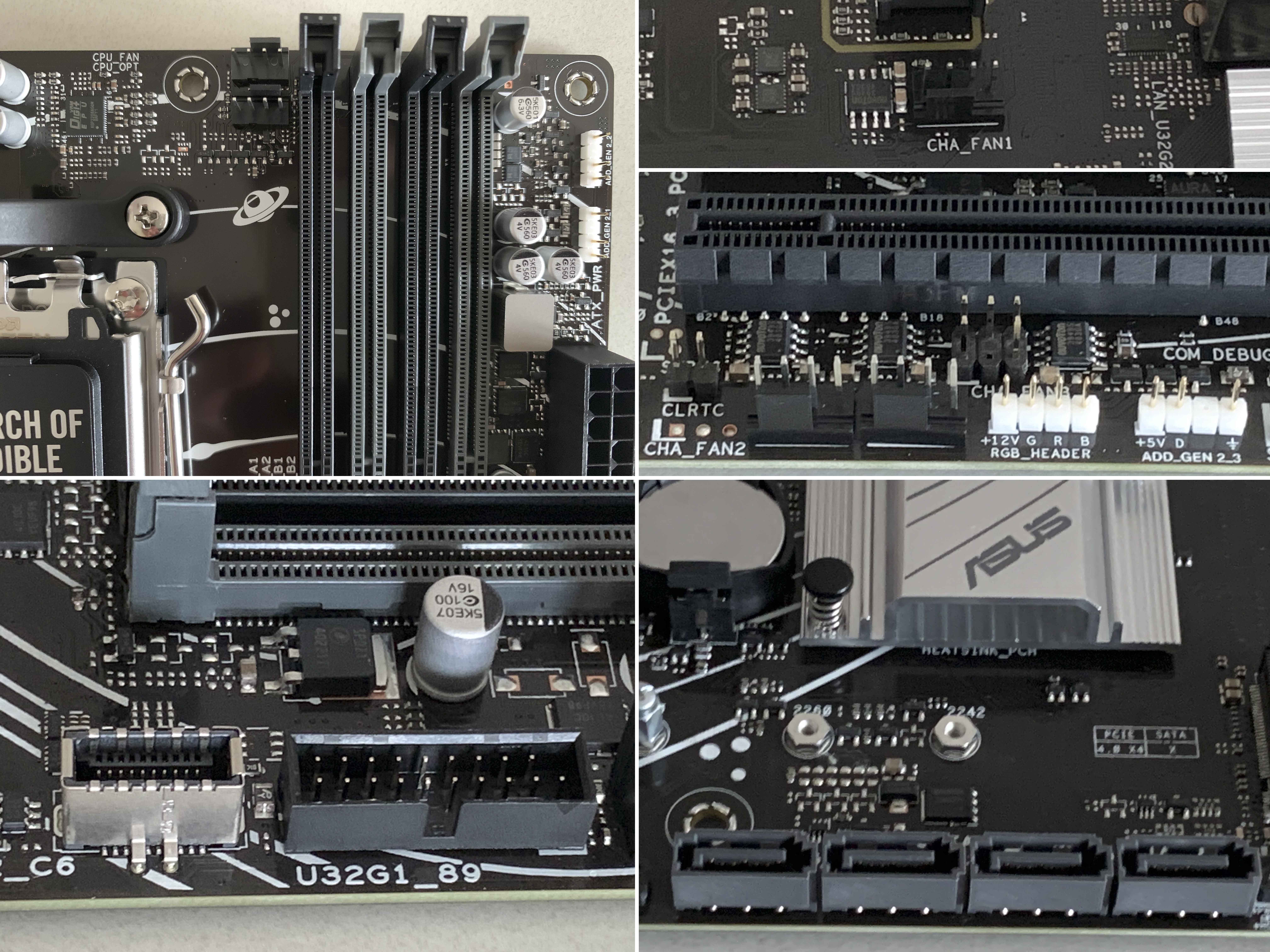 상단에는 CPU_FAN, CPU_OPT, 5V 3핀 ARGB 포트 2개, 전원부 방열판 밑에 CHA_FAN1, 하단에는 CHA_FAN2, CHA_FAN3, 5V 3핀 ARGB 포트 1개로, 요즘 어항케이스가 유행인데 팬 허브가 없더라도 메인보드에 직접 연결 사용할 수 있도록 넉넉하게 지원합니다. M.2 슬롯 2개 뿐만 아니라, PC케이스에서 전면 USB3.2 Gen1 Type-C, SATA3 포트 4개 지원으로, 내장 및 외장 저장 공간이 많이 필요한 분에게 포트를 넉넉하게 지원합니다.